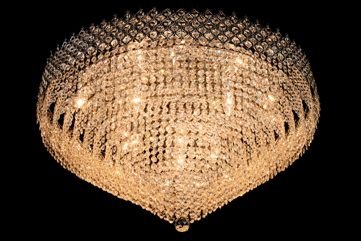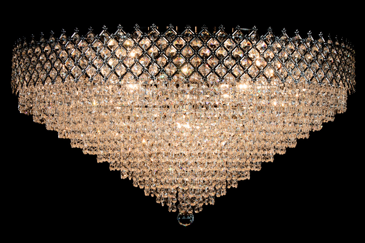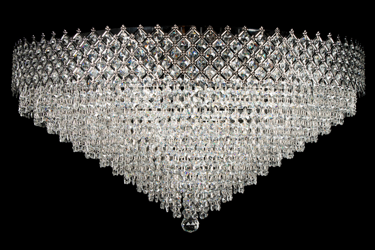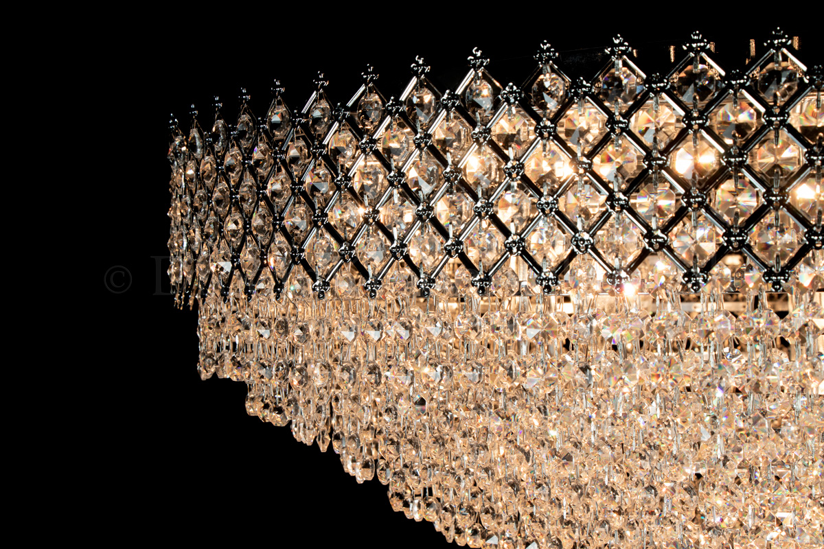 This beautiful ceiling lamp, decorated with shiny crystals, has 12 lights, a diameter of 31.5 Inch (80 centimetres) and is just like a crown (upside-down). This ceiling lamp has a broad  checkered chromecoloured band, filled with beautiful crystals. The crystal ceiling lamp Amy has a royal appearance. Due to the limited height, it's ideal for the rooms with lower ceilings. But due to it's size, Amy still stands out in the larger rooms.