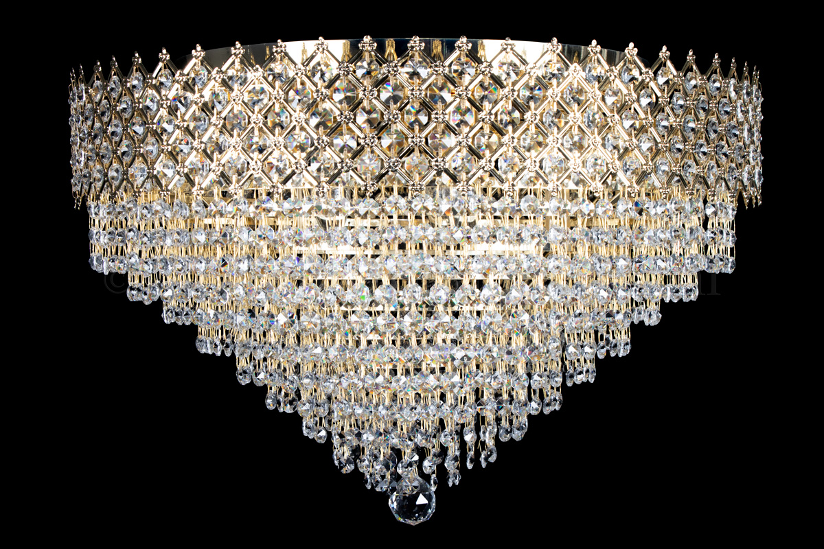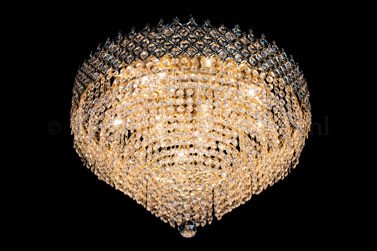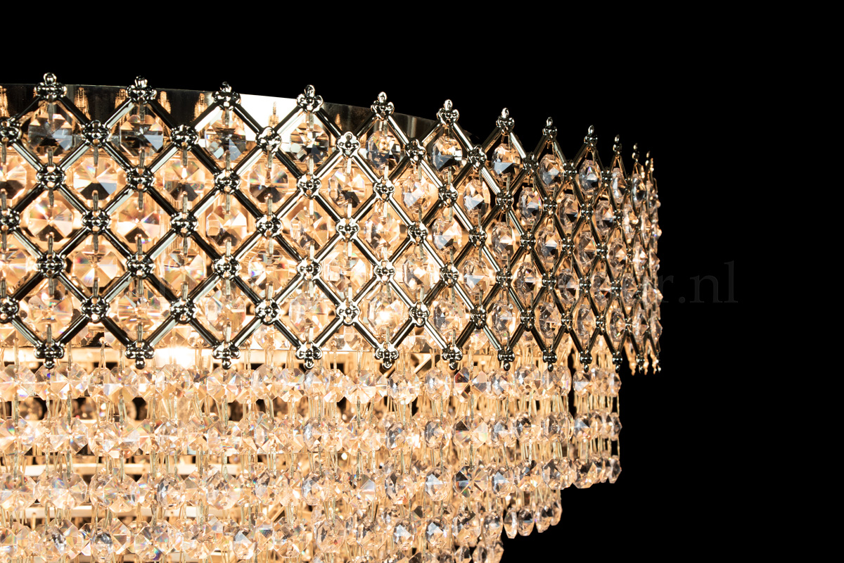 This beautiful ceiling lamp, decorated with shiny crystals, has 9 lights, a diameter of 23.6 Inch (60 centimetres) and is just like a crown (upside-down). This ceiling lamp has a broad checkered goldcoloured band, filled with beautiful crystals. The crystal ceiling lamp Amy has a royal appearance. Due to the limited height, it's ideal for the rooms with lower ceilings. But due to it's size, Amy still stands out in the larger rooms.