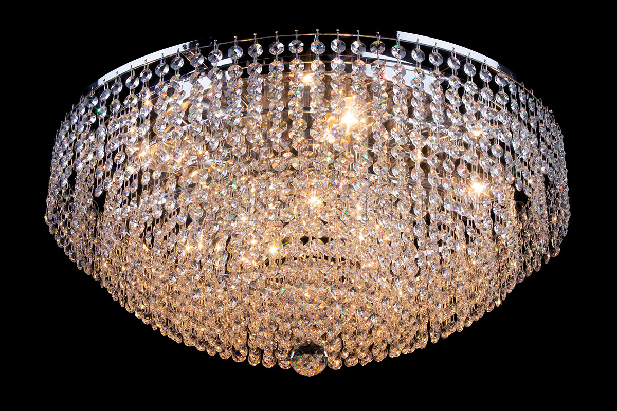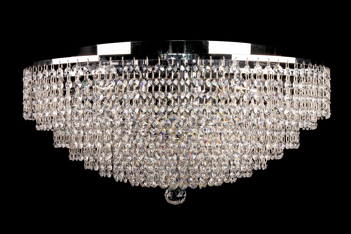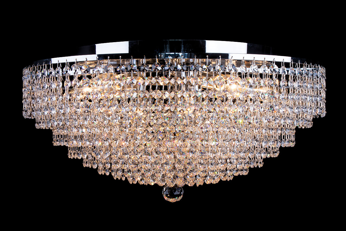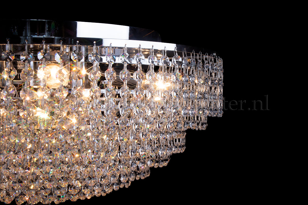 This classic ceiling lamp in the Livia series has 8 lights, a diameter of 23.6 Inch (60 centimeters) and a height of approx. 11.8 Inch (30 cm). This ceiling lamp is made of beautiful crystal and has chrome-coloured borders. The 60cm Livia crystal ceiling lamp gives your room a warm and attractive appearance while maintaining the height of your ceiling.