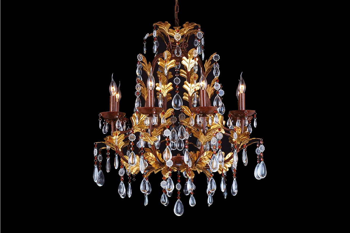 The cones are made of crystal. The fixture is made of metal. At the bottom of the chandelier hangs a strand of glass diamonds with a sphere at the end.The classic chandelier with graceful arms in the shape of a leaf are fitted with glass diamonds.