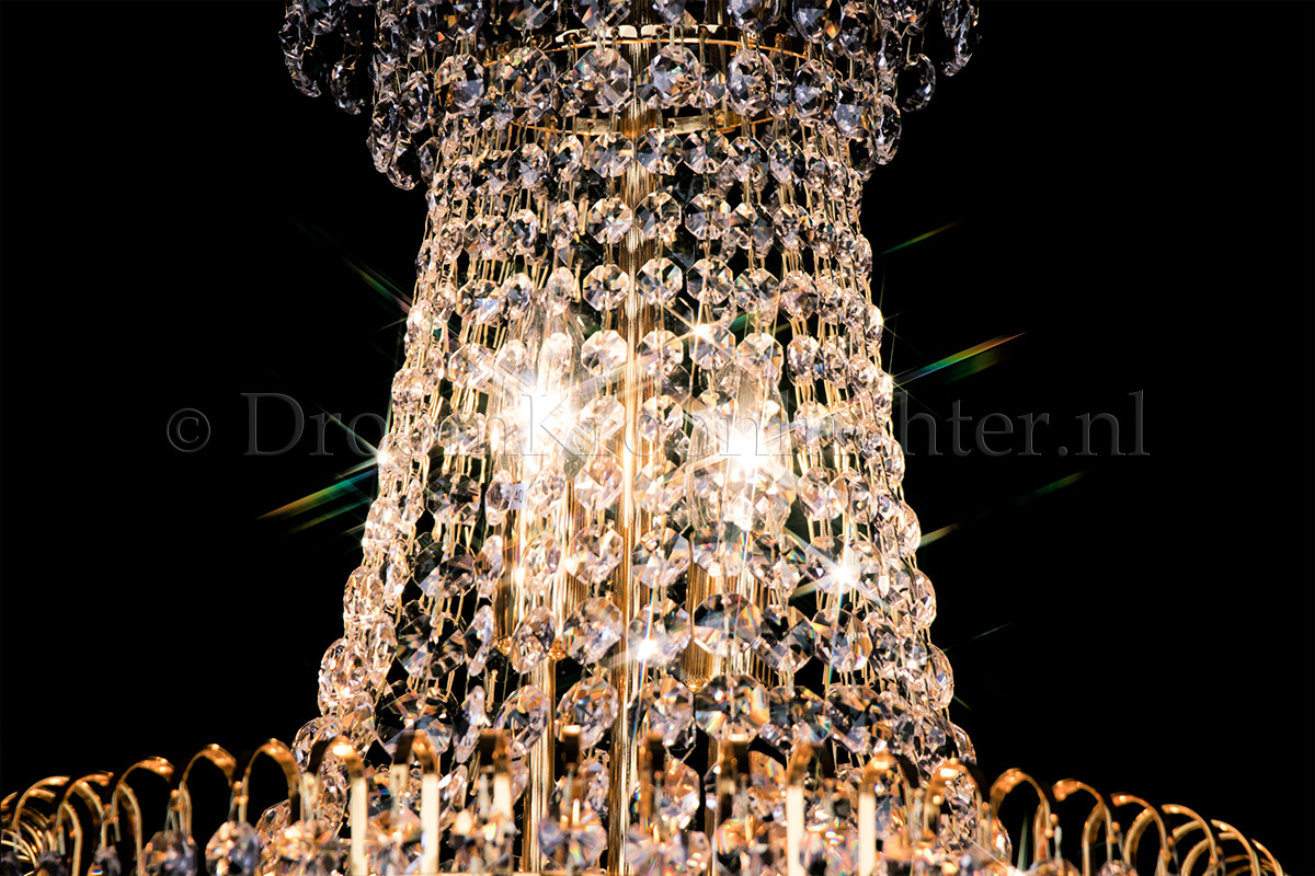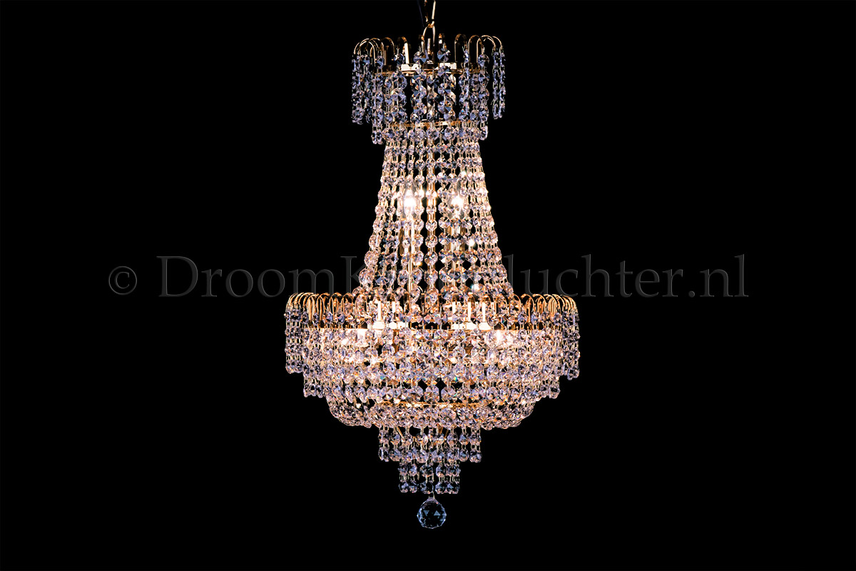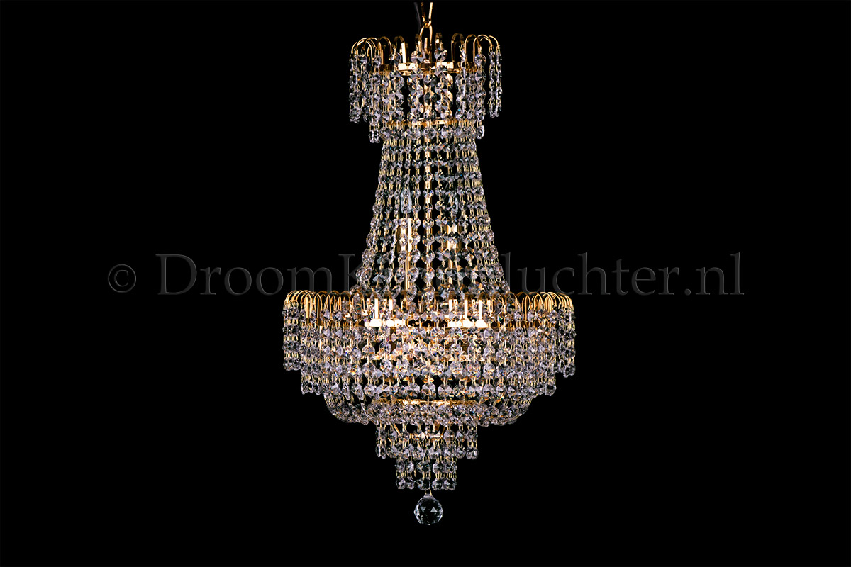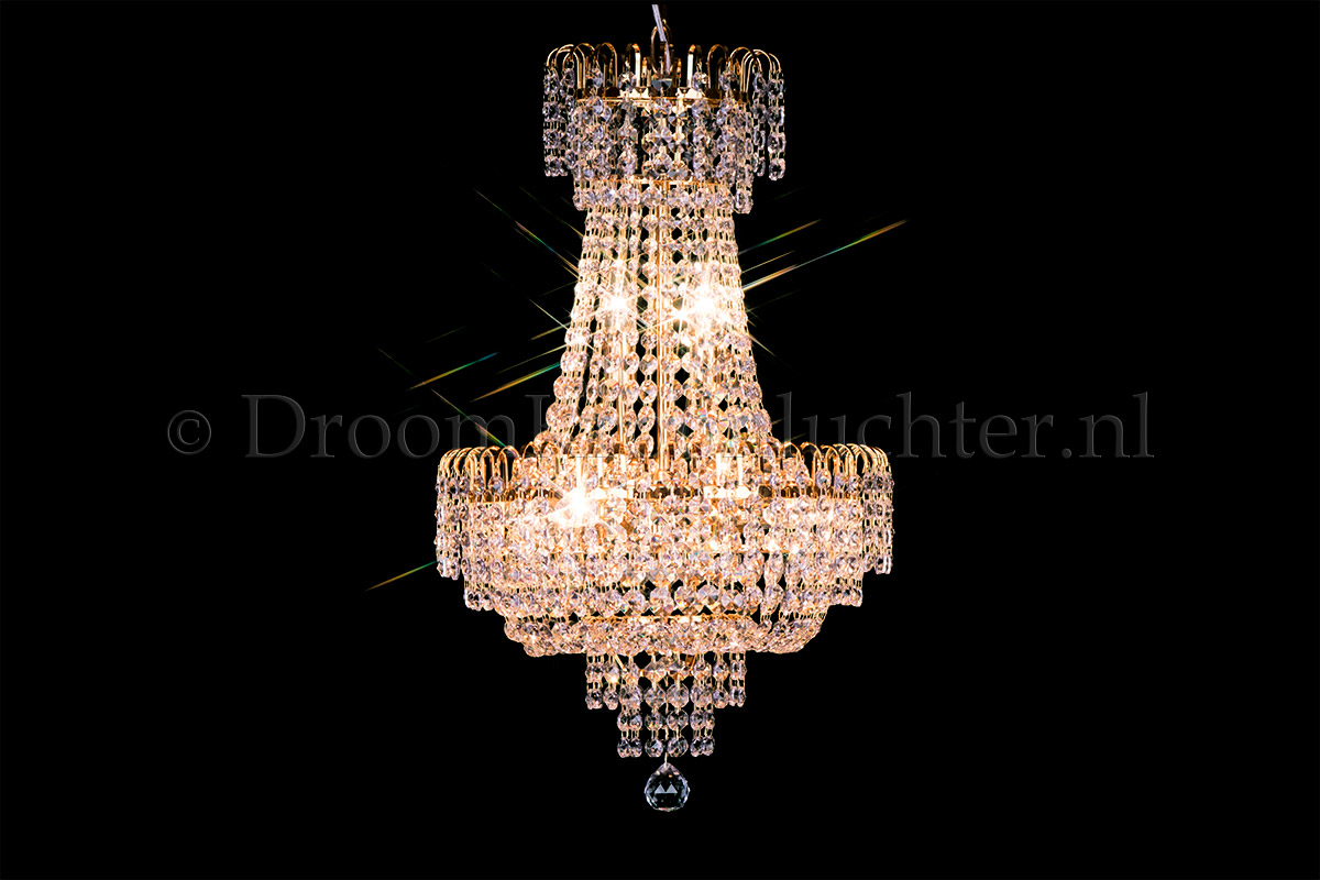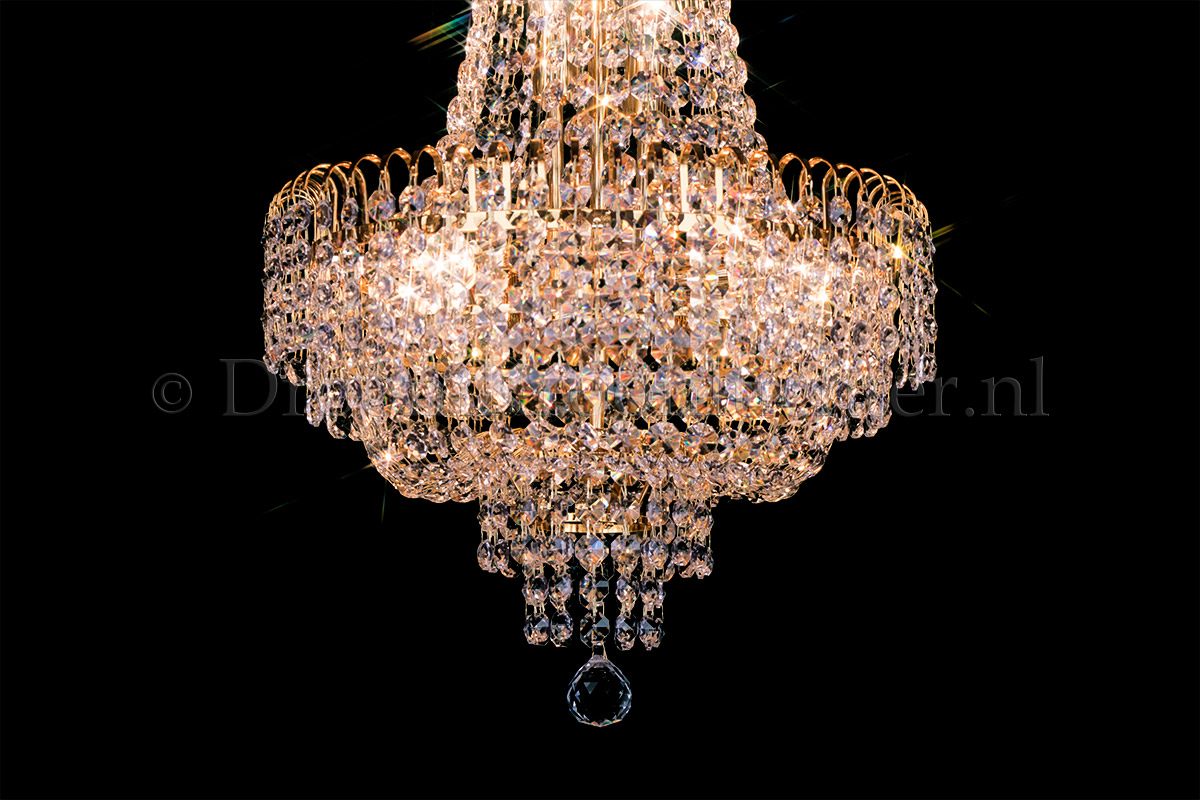 This classic and multi-layered empire chandelier has 6 light points, a diameter of 15.7 Inch (40cm) and a height of no less than 27.5 Inch (70cm). This empire chandelier is made of beautiful crystal and has a gold coloures frame. The crystal empire chandelier gives your room a warm and attractive appearance. Order now!