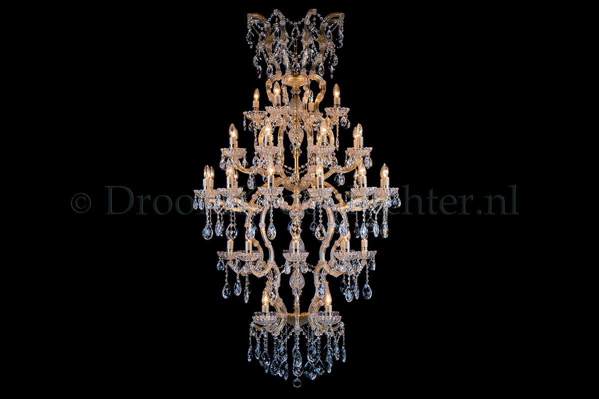 A beautiful chandelier with 36 arms and lights. Due to the limited width (100cm) and greater length (180cm), this model is very suitable for a loft, for example. The crystal chandelier Maria Theresa is goldcoloured with a perfect finish.