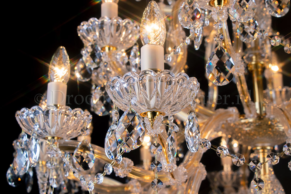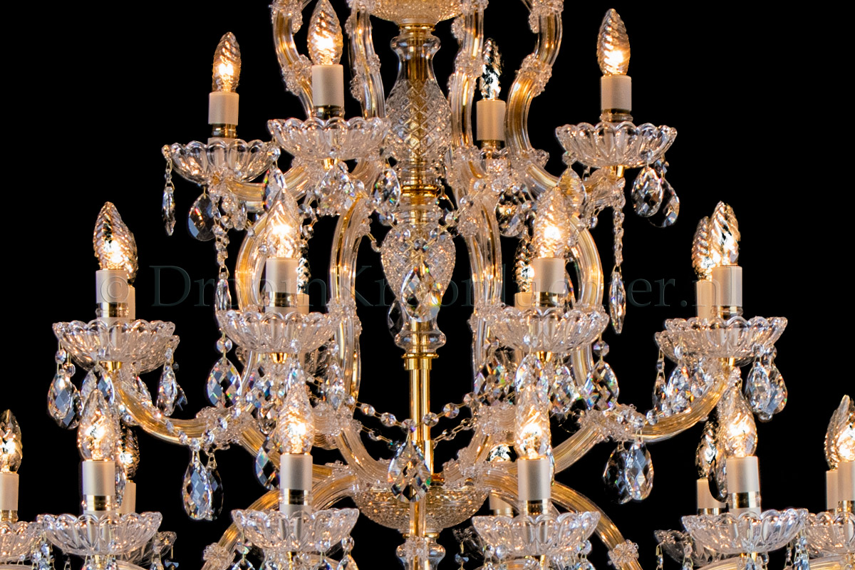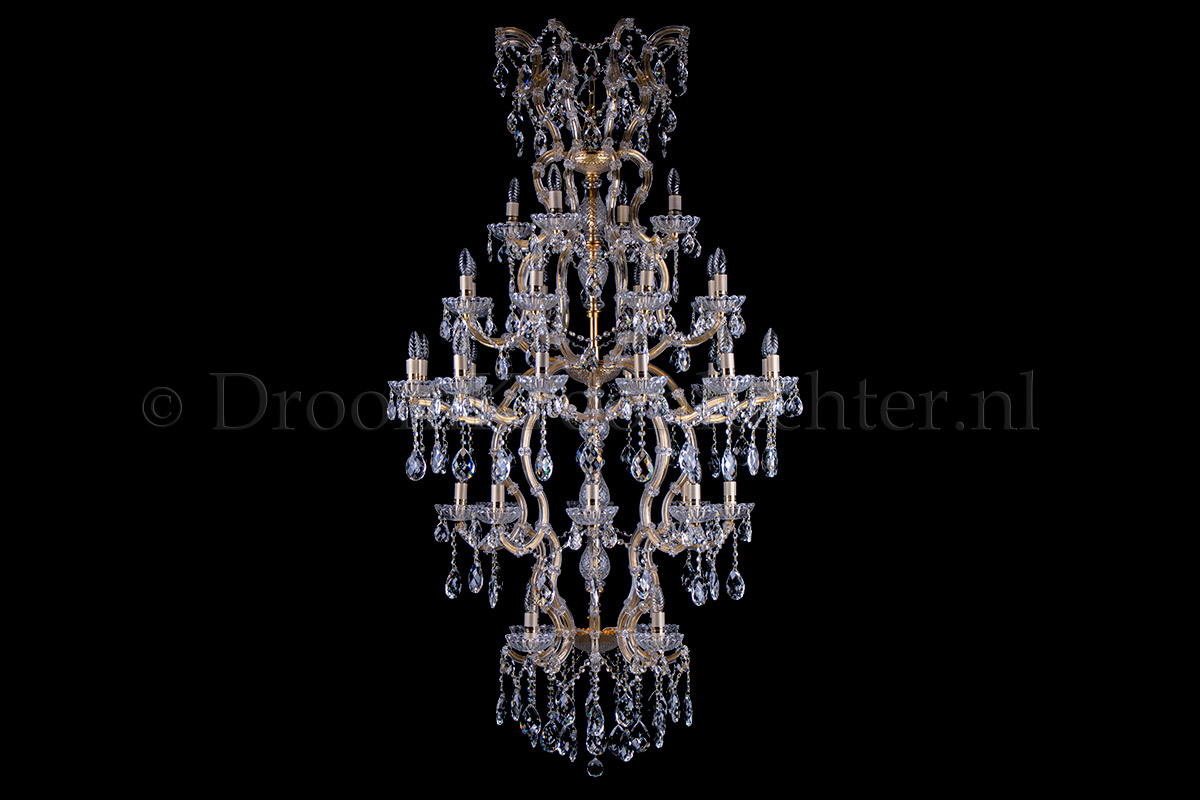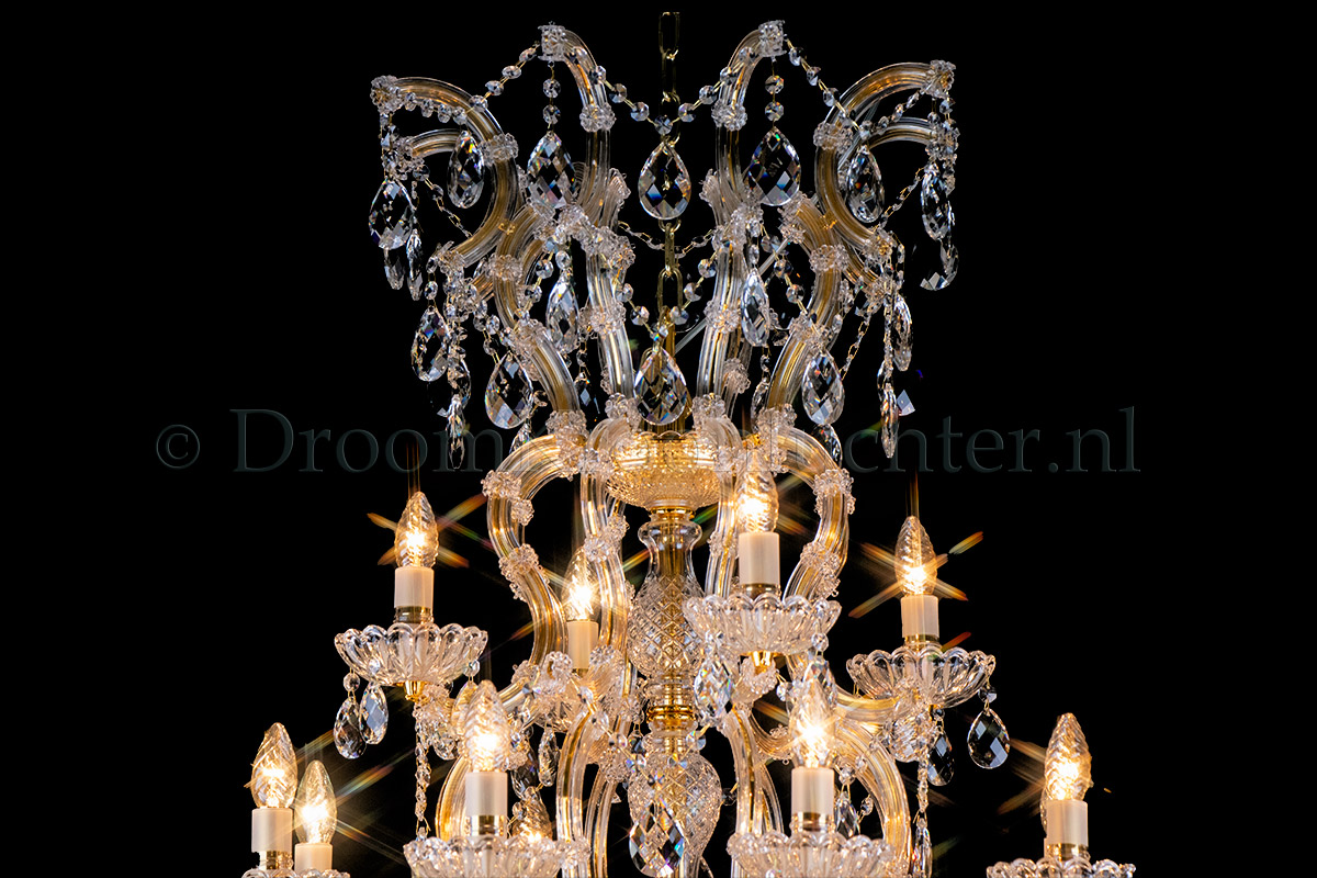 A beautiful chandelier with 24 arms and lights. The crystal chandelier Maria Theresa is gold coloure..