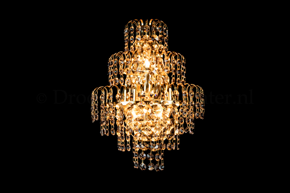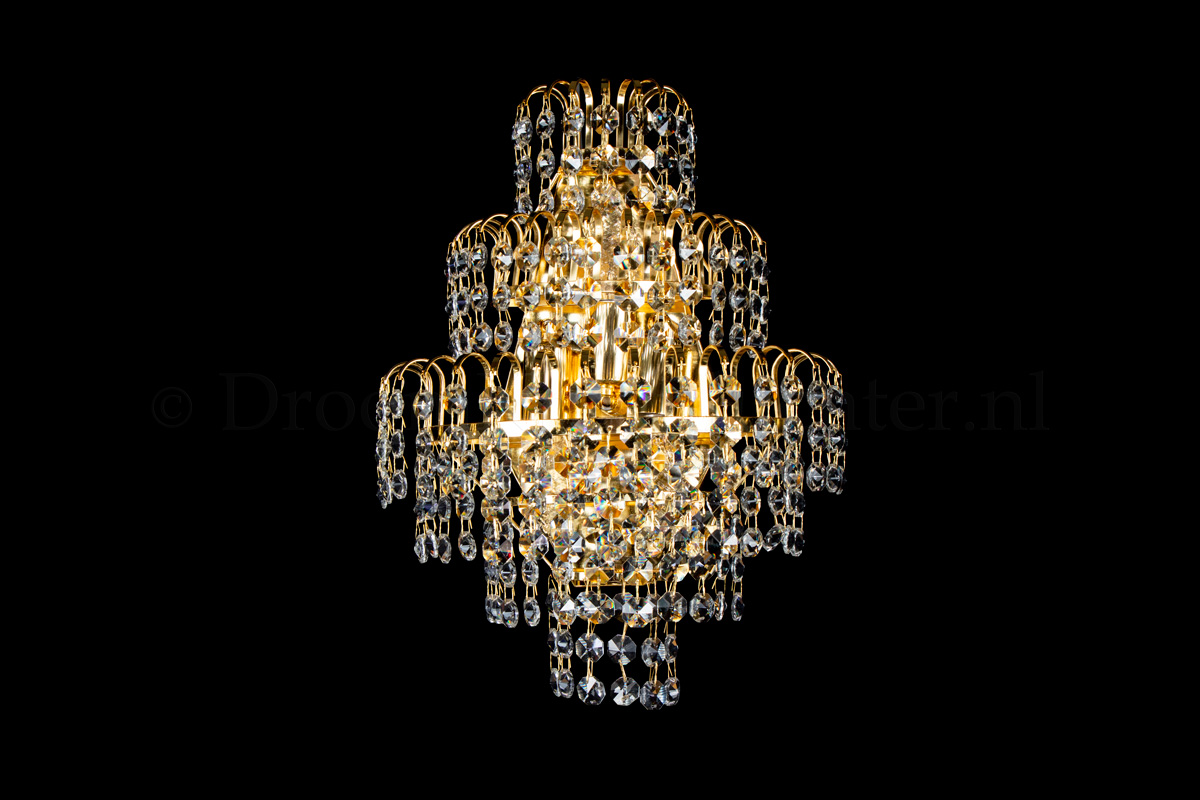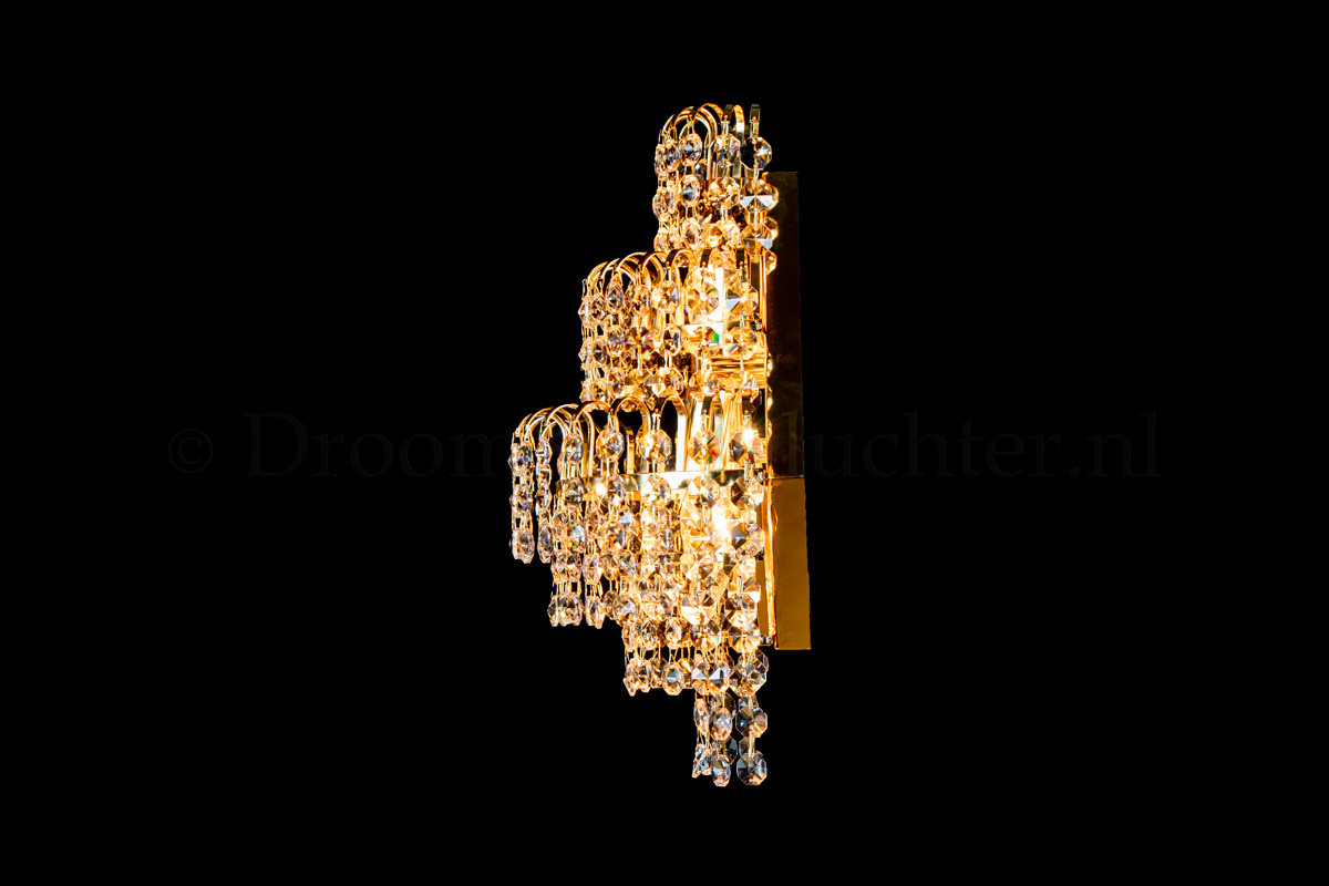 This beautiful wall lamp has 3 lights, is 11.8 Inch (30cm) wide and is 15.75 Inch (40cm) in height. The Salle wall light consists of 3 layers of Goldcoloured metal, hung with beautiful crystal. This wall lamp gives your room an attractive appearance.