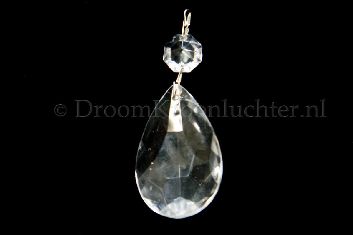 Glass Pendant Drop for chandeliers. Available in 50mm en 63mm, optionally available with small beads and metal clips. Beautiful design due to the beautiful shape, can also be used in a crystal curtain or as a decoration.