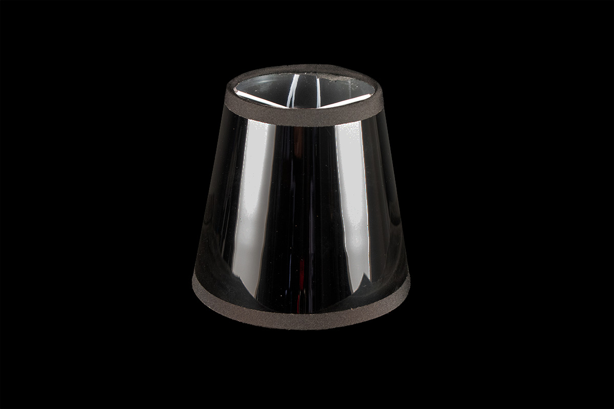 Deze spiegelende zwart zilveren lampenkapjes zijn speciaal ontworpen en geschikt voor bevestiging op de lampen van kroonluchters. Het lampenkapje is doorschijnend en de kleur van de binnenkant is zilver. De boven en onderkant van de klemkap is afgewerkt met een zwarte bies. De afmeting is 12x11x8cm (diameter onderkant, hoogte, diameters bovenkant)