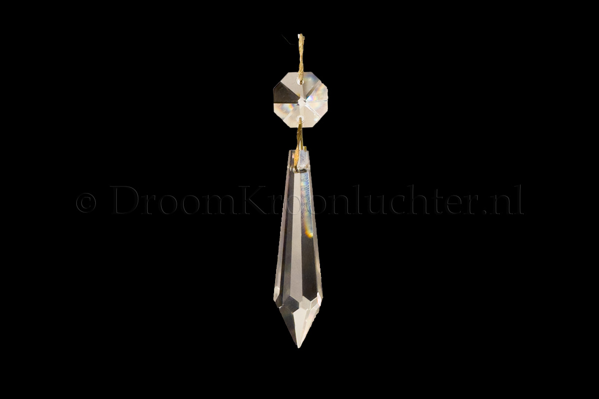 Kristallen IJspegel voor kroonluchters. Verkrijgbaar in 38mm, 55mm, 63mm, optioneel verkrijgbaar met kleine kristallen en metalen clips. Schitterende uitvoering door de mooie vorm, ook te gebruiken in een kristalgordijn of als decoratie.