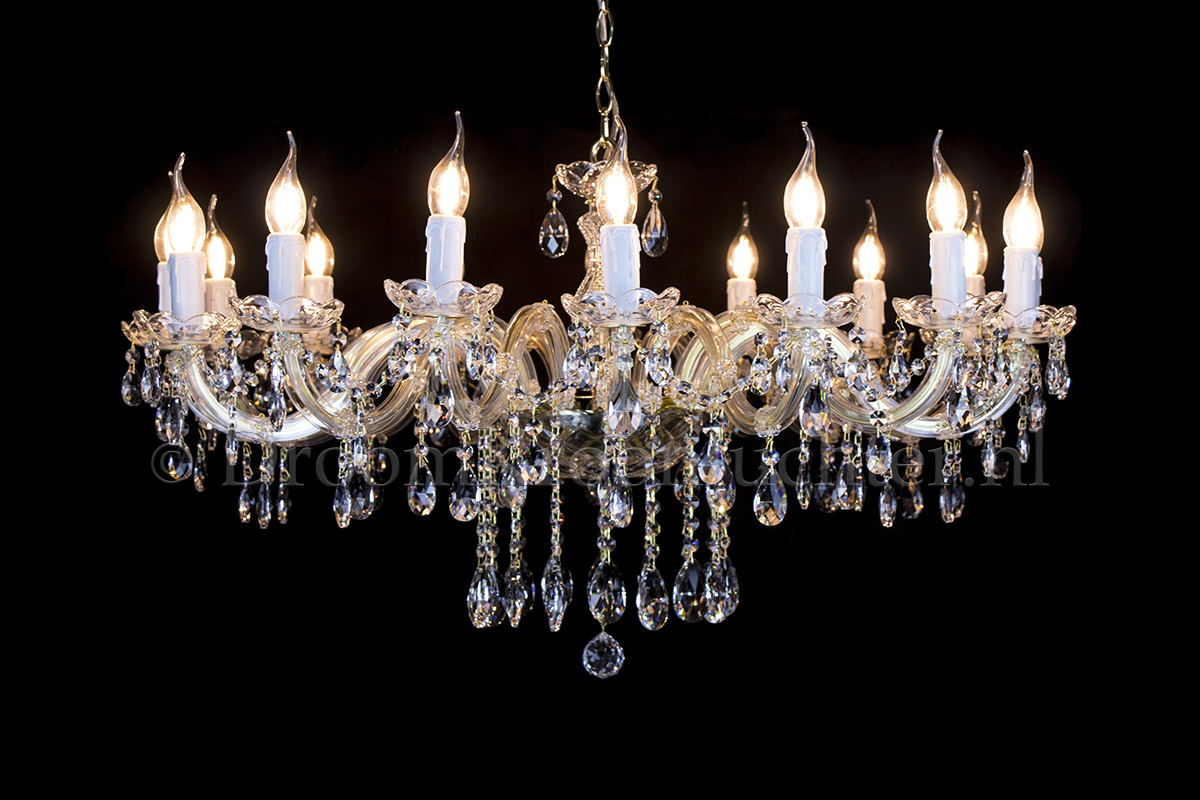 Een prachtige kristallen kroonluchter met 12 lichtpunten op een laag. De Maria Theresa 12 lichts kro..