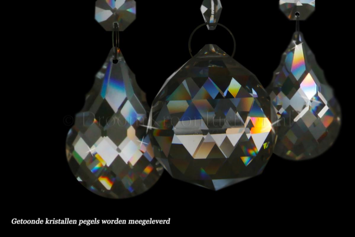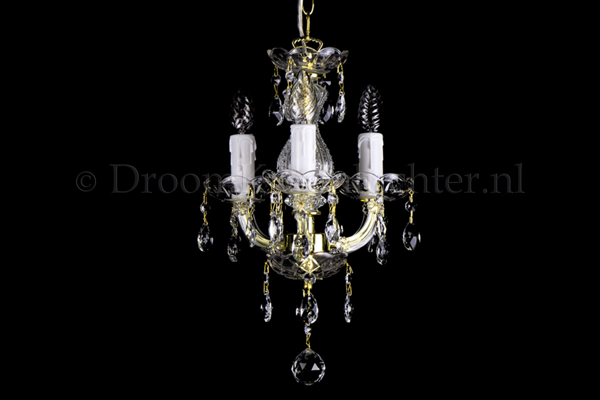 Een prachtige kristallen kroonluchter met 3 lichtpunten. De Maria Theresa 3 lichts kroonluchter van kristal is uitgevoerd in kleur messing en heeft een perfecte afwerking. De pegels zijn van schitterend kristal. Het armatuur is een combinatie van kunststof en messing.