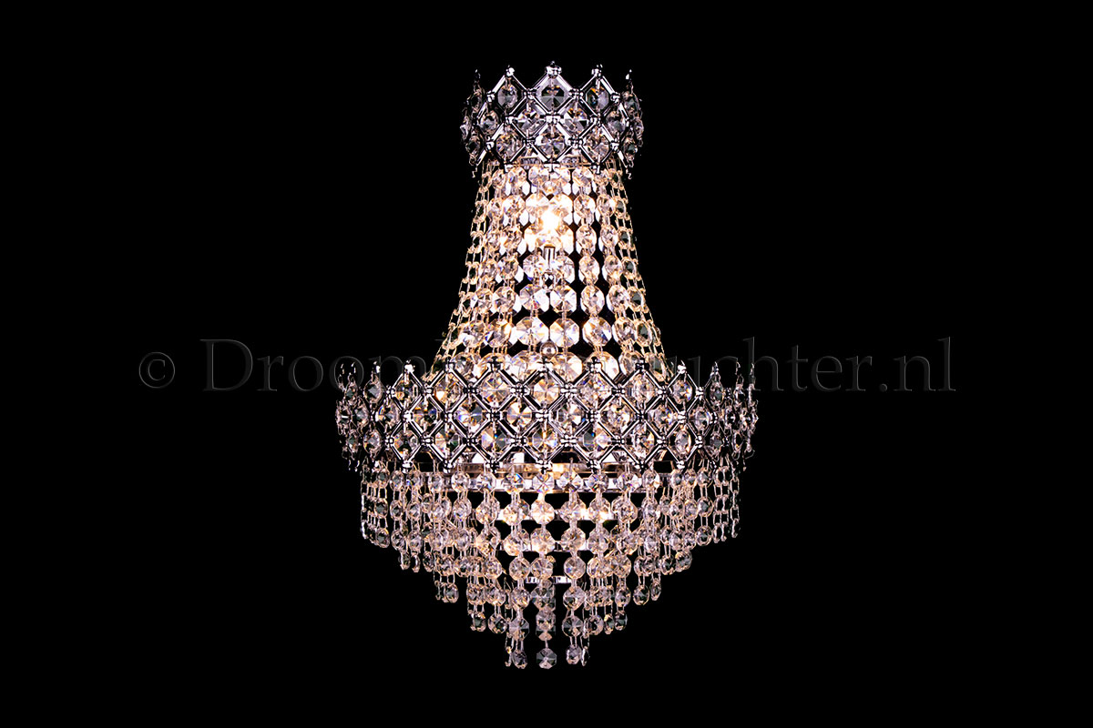 Maria Theresa wandlamp met 1 lichtpunt. Armatuur is van Chroom met vol kristallen pegels.A..