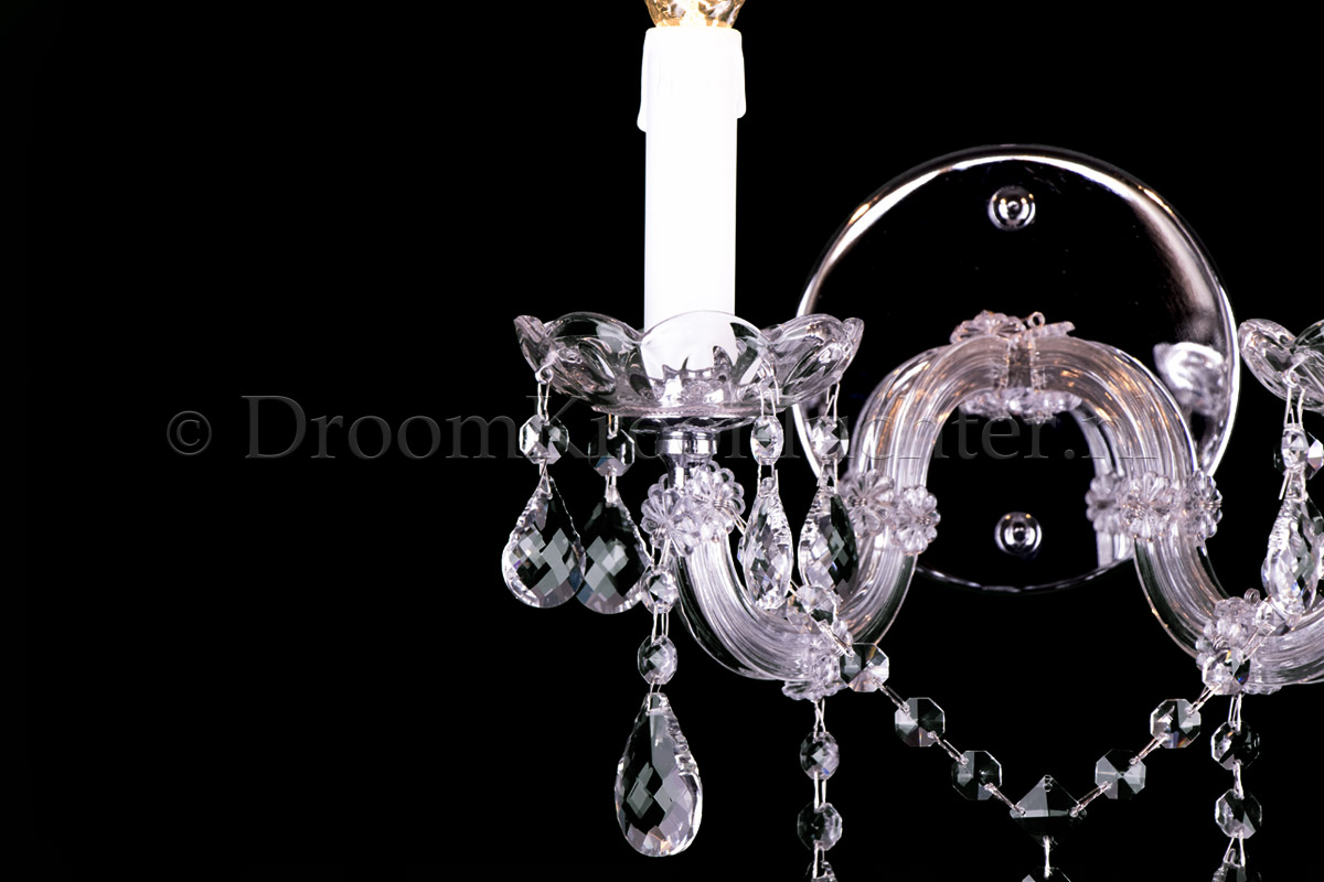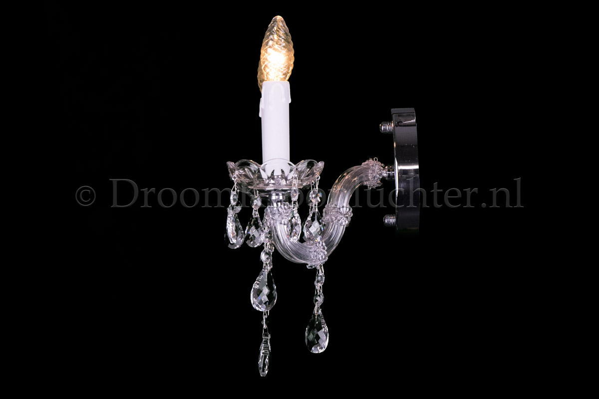 Maria Theresa wandlamp met 1 lichtpunt. Armatuur is van Chroom met vol kristallen pegels.A..
