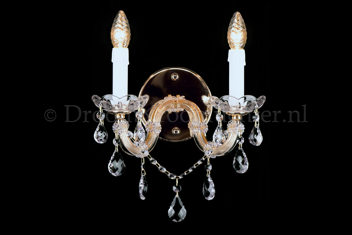 Maria Theresa wandlamp met 2 lichtpunten. Armatuur is van Messing met vol kristallen pegels.