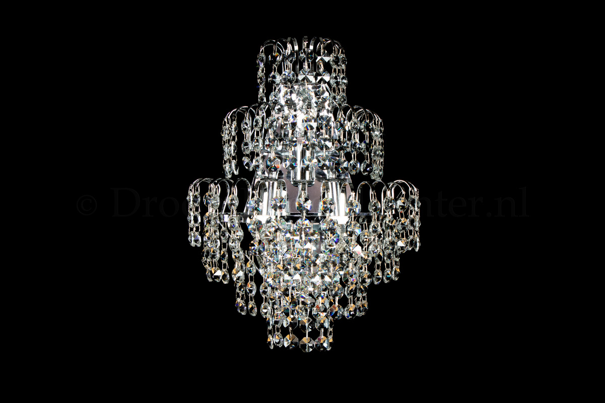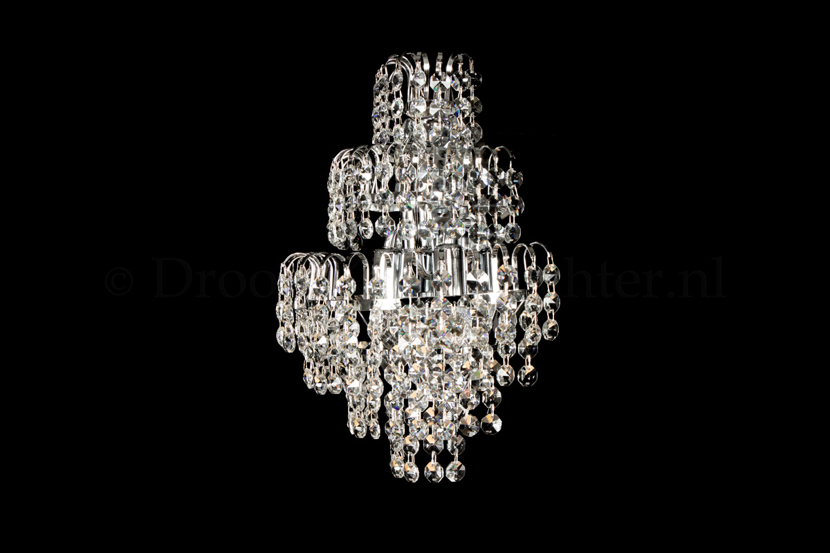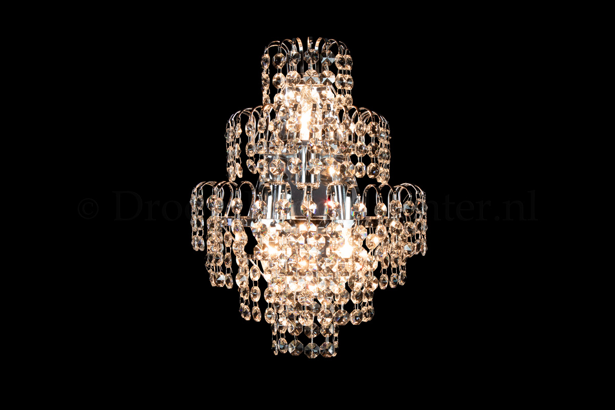 Deze prachtige kristallen wandlamp heeft 3 lichtpunten, is 30cm breed en 40cm hoog. De Salle wandlamp bestaat uit 3 lagen chroom metaal, behangen met schitterend kristal. Deze wandlamp geeft uw ruimte een sfeervolle uitstraling.