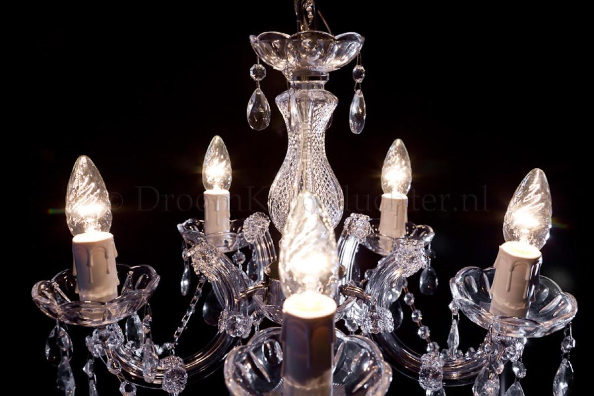 Een prachtige kroonluchter met 5 lichtpunten. De Maria Theresa 5 lichts kroonluchter is uitgevoerd in chroom en heeft een perfecte afwerking. Zowel de schalen, de pegels als de middenkolom of siervaas zijn gemaakt van glas. Het armatuur is een combinatie van kunststof en chroom. Onderaan de kroonluchter hangt een strengel van glasdiamanten met een bol aan het uiteinde. model 350110014