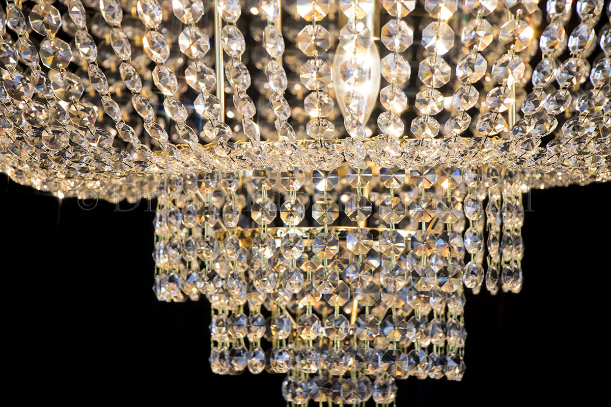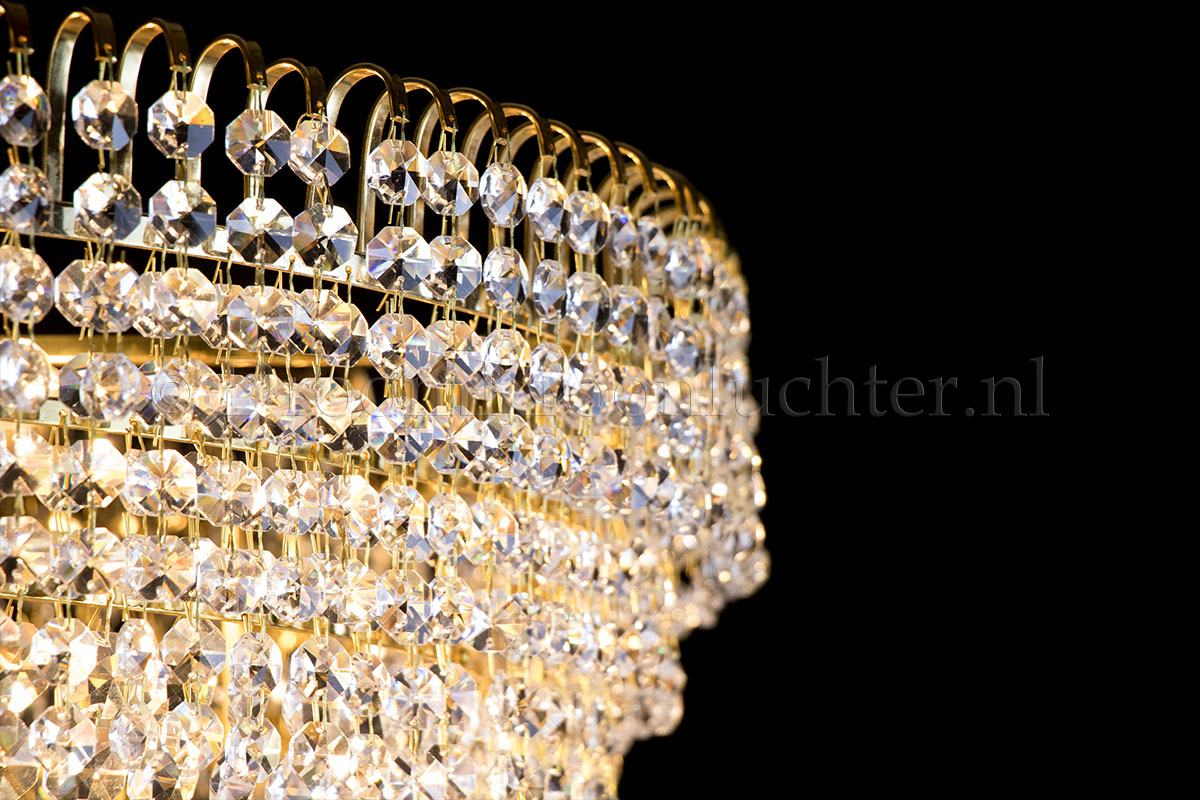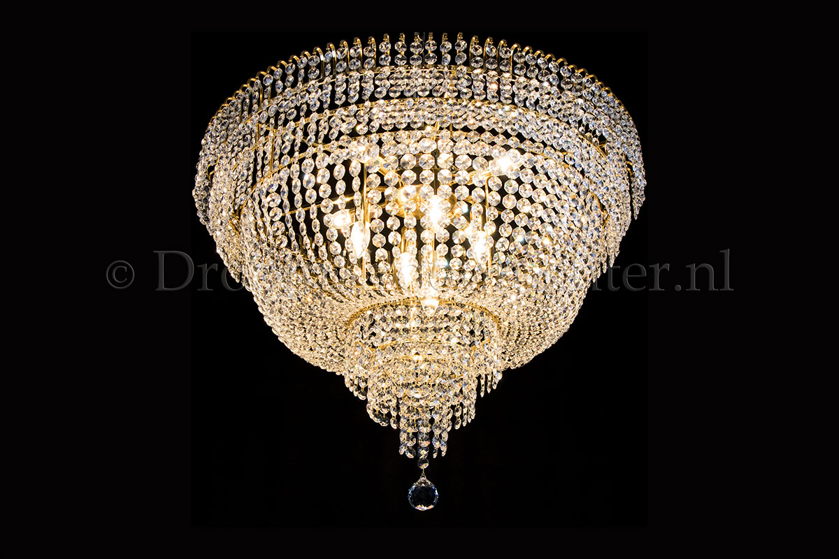 Deze klassieke en meerlaagse plafonnière heeft 9 lichtpunten, een diameter van 80 centimeter en een hoogte van 65cm. Ideaal voor plaatsing in een doorloop met plafondhoogtes vanaf 2.85 meter. Deze plafonnière is uitgevoerd in prachtig kristal en voorzien van gouden randen.De kristallen plafonnière Salle van 80cm diameter en 65 cm hoogte, geeft uw ruimte een warme en sfeervolle uitstraling.