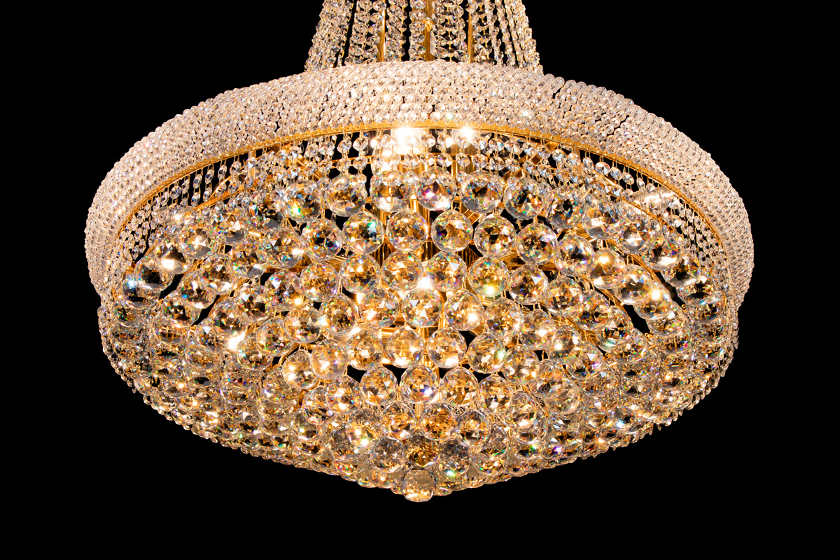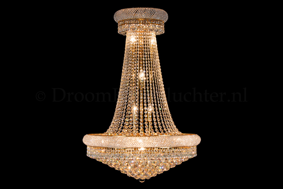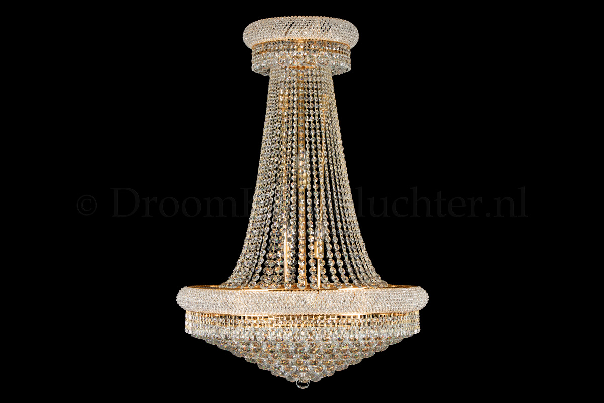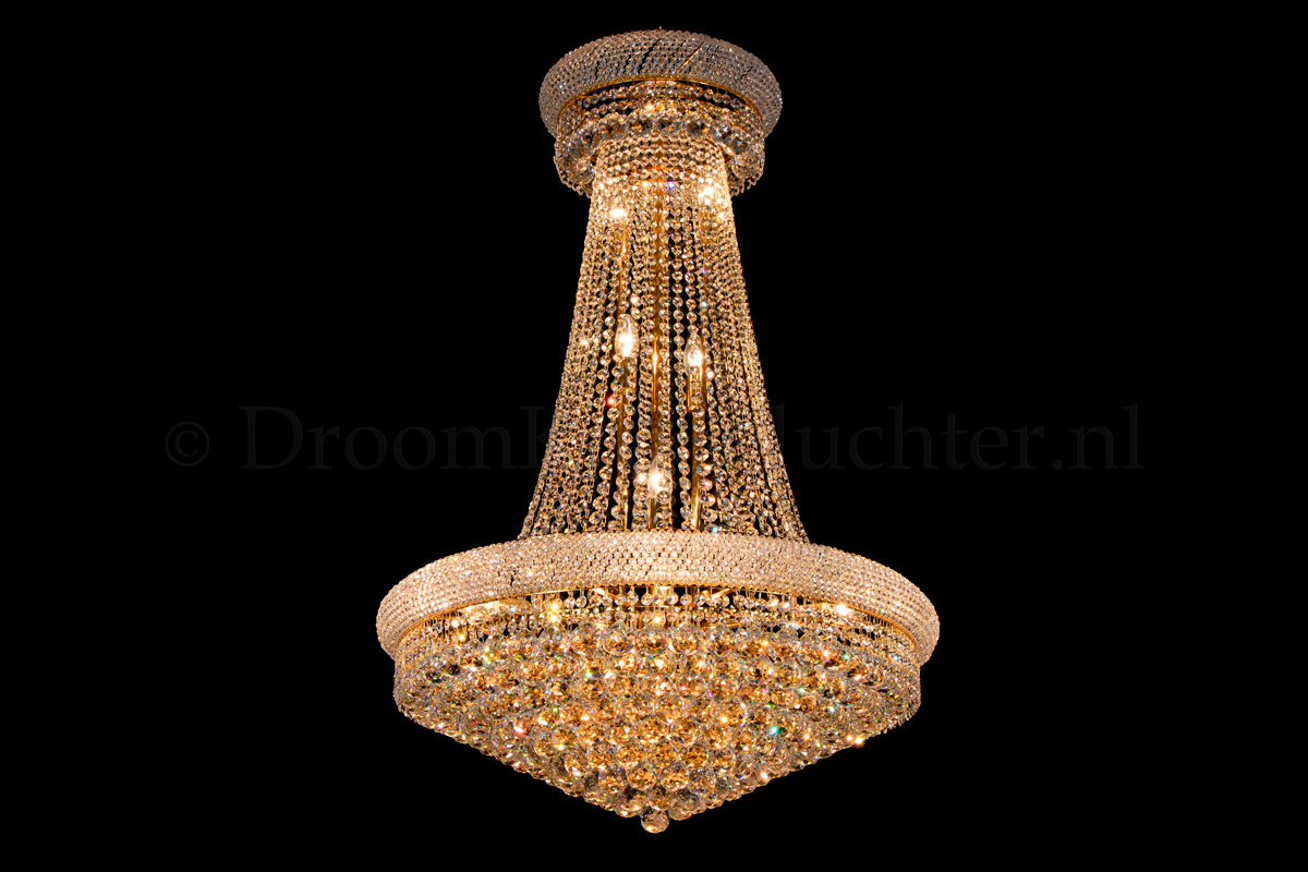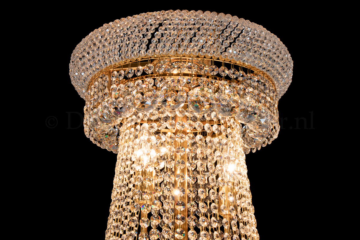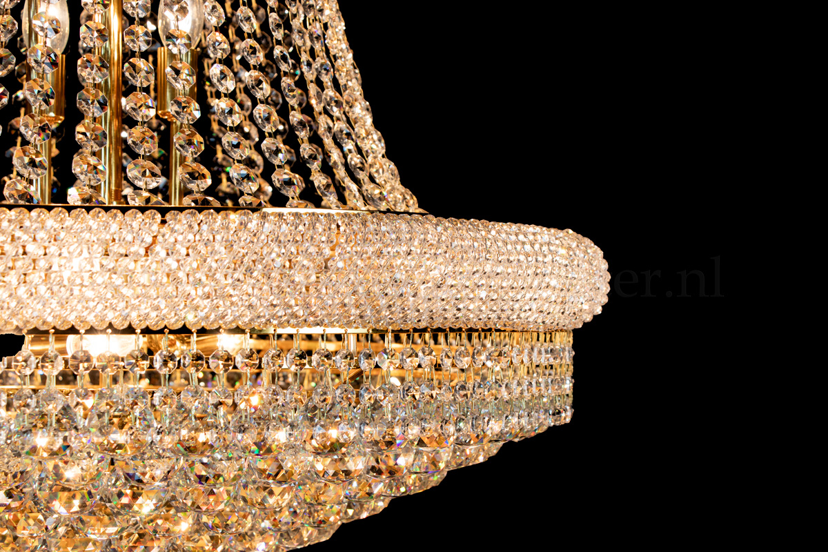 Deze klassieke en meerlaagse zakkroonluchter heeft 15 lichtpunten. De diameter is maar liefst 80 centimeter en de hoogte maar liefst 110cm. Deze zakkroonluchter is uitgevoerd in prachtig kristal en voorzien van een gouden afwerking. De kristallen zakkroonluchter geeft uw ruimte een warme en sfeervolle uitstraling.