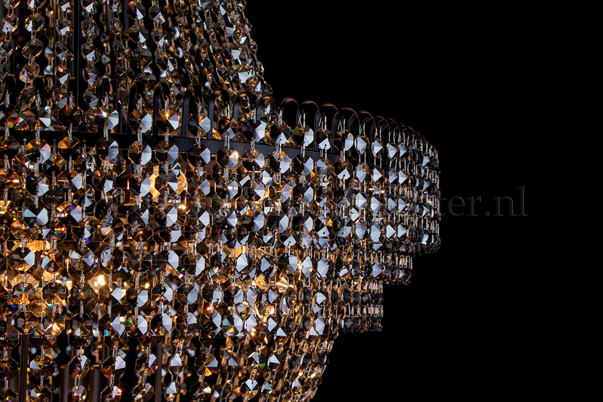 Deze klassieke en meerlaagse zakkroonluchter heeft 19 lichtpunten. De diameter is maar liefst 80 centimeter en een hoogte van maar liefst 130cm. Deze zakkroonluchter is uitgevoerd in prachtig zwart rookglas kristal en voorzien van een mat zwarte afwerking. De kristallen zakkroonluchter geeft uw ruimte een warme en sfeervolle uitstraling.Een mooie zakkroonluchter voor een droomprijs! Nu te bestellen.