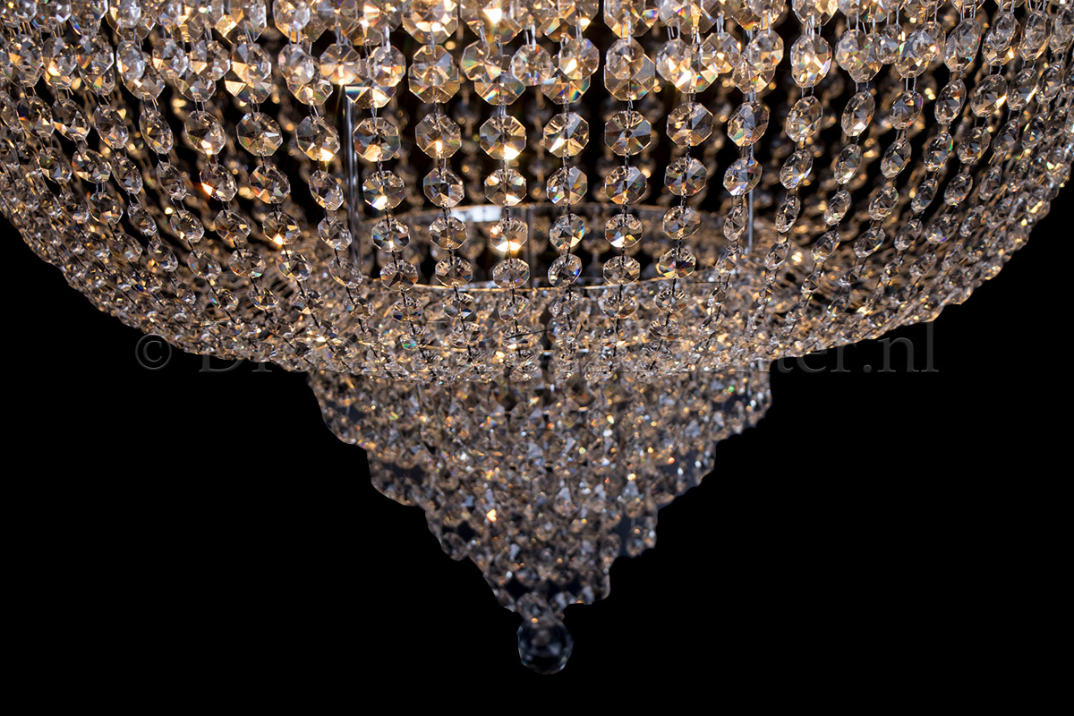 Deze klassieke en meerlaagse zakkroonluchter heeft 24 lichtpunten. De diameter van deze prachtige zakkroonluchter is maar liefst 1 meter en heeft een hoogte van maar liefst 150cm. Deze zakkroonluchter is uitgevoerd in prachtig kristal en voorzien van chromen afwerking. De kristallen zakkroonluchter geeft uw ruimte een warme en sfeervolle uitstraling.