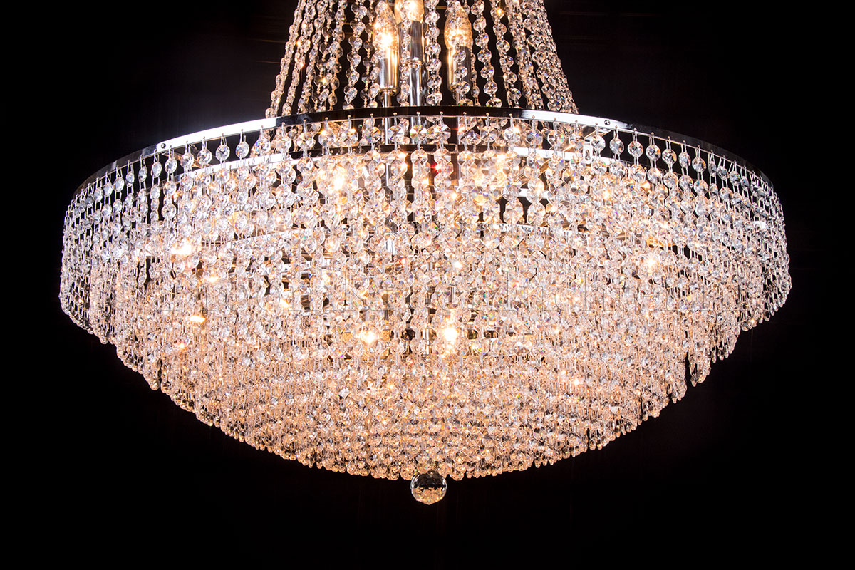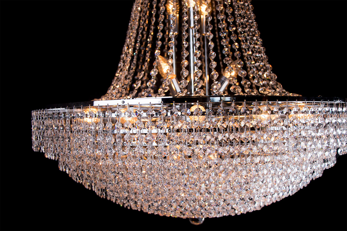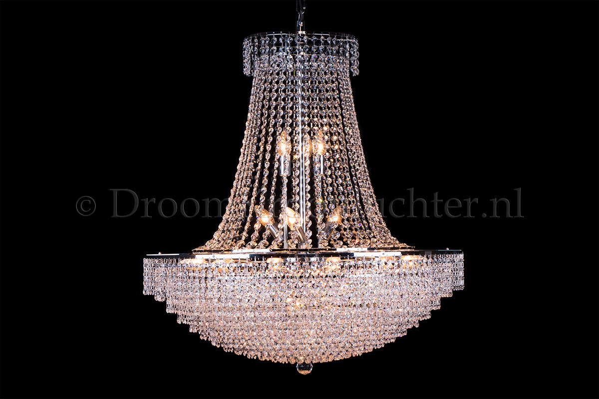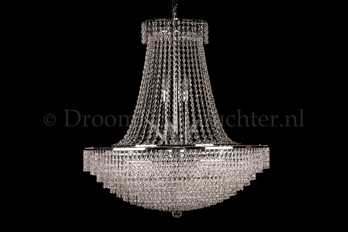 Deze klassieke en meerlaagse zakkroonluchter heeft 24 lichtpunten, een diameter van 80 centimeter en een hoogte van 90cm. De onderkant bevat 14 lagen vol kristal. Deze zakkroonluchter is uitgevoerd in prachtig kristal en voorzien van chromen randen. De kristallen zakkroonluchter geeft uw ruimte een warme en sfeervolle uitstraling.Een mooie zakkroonluchter voor een droomprijs! Nu te bestellen.