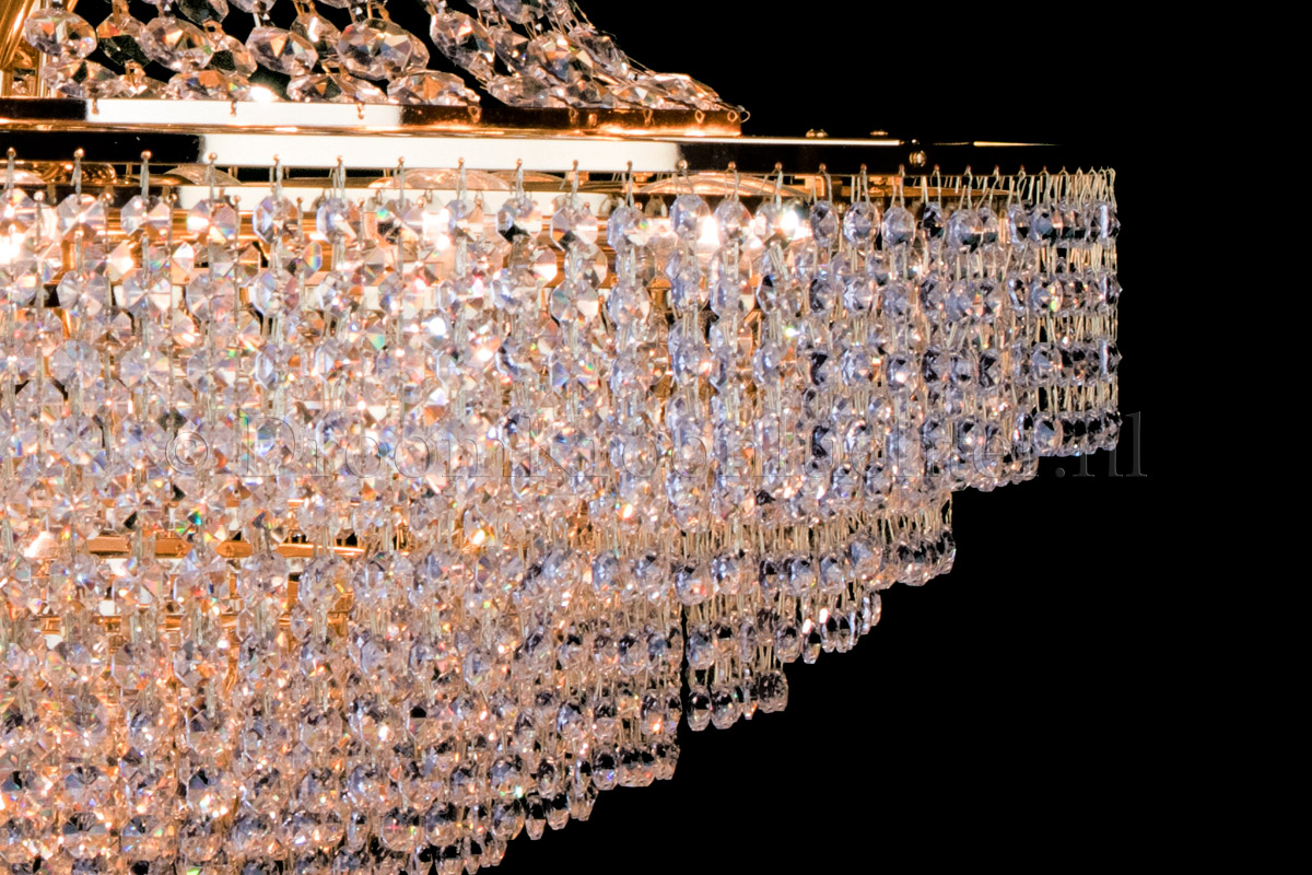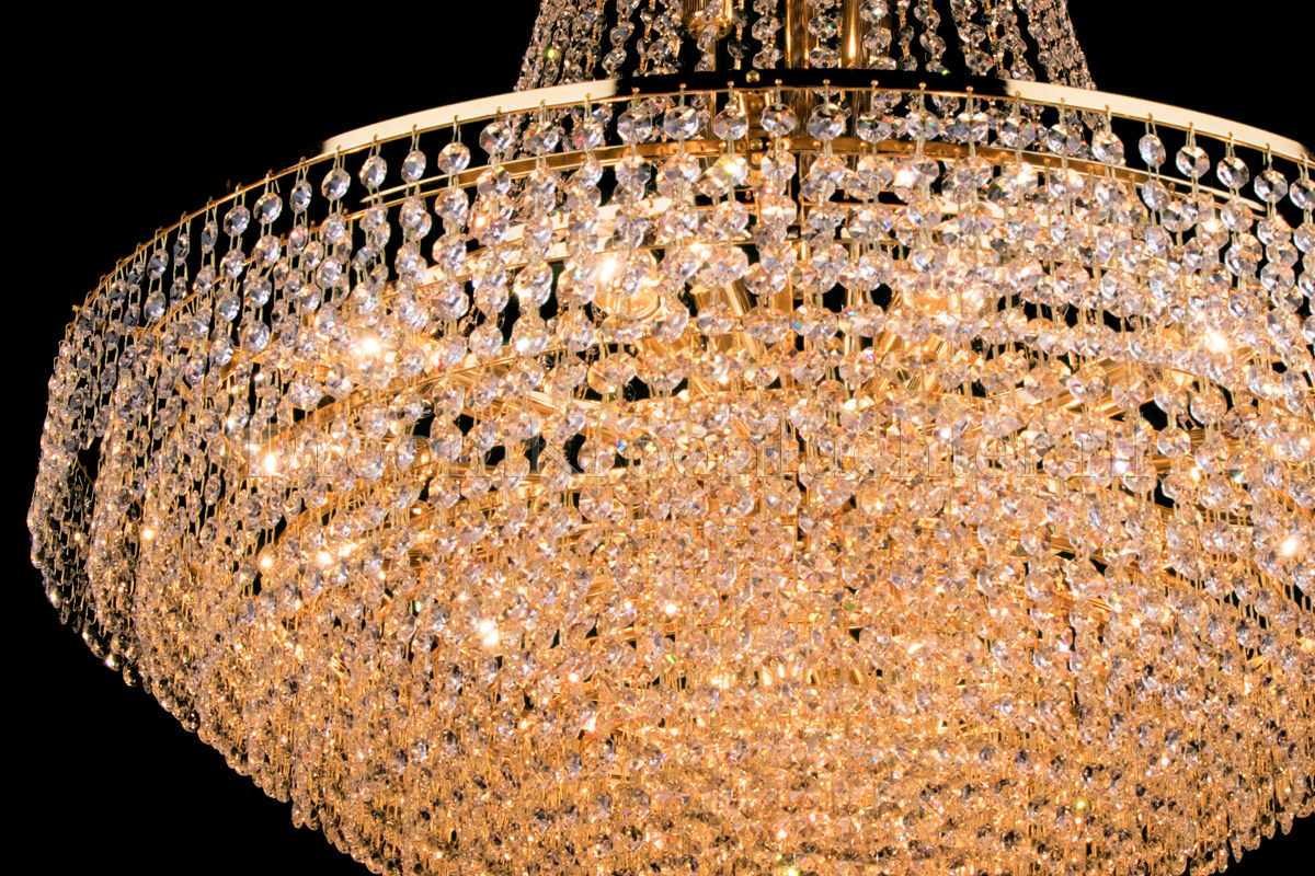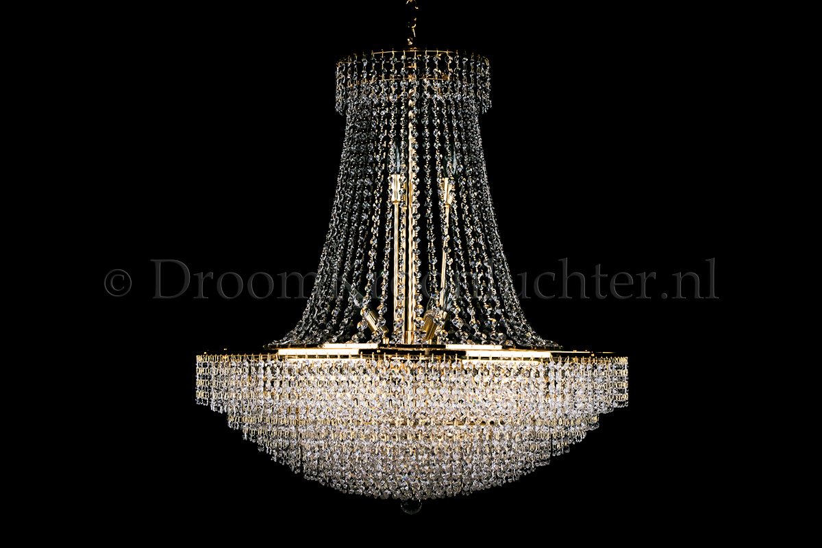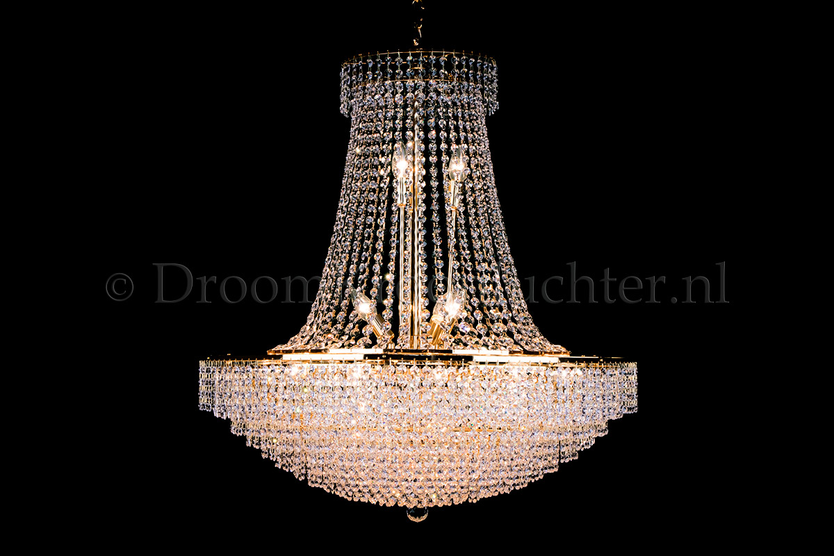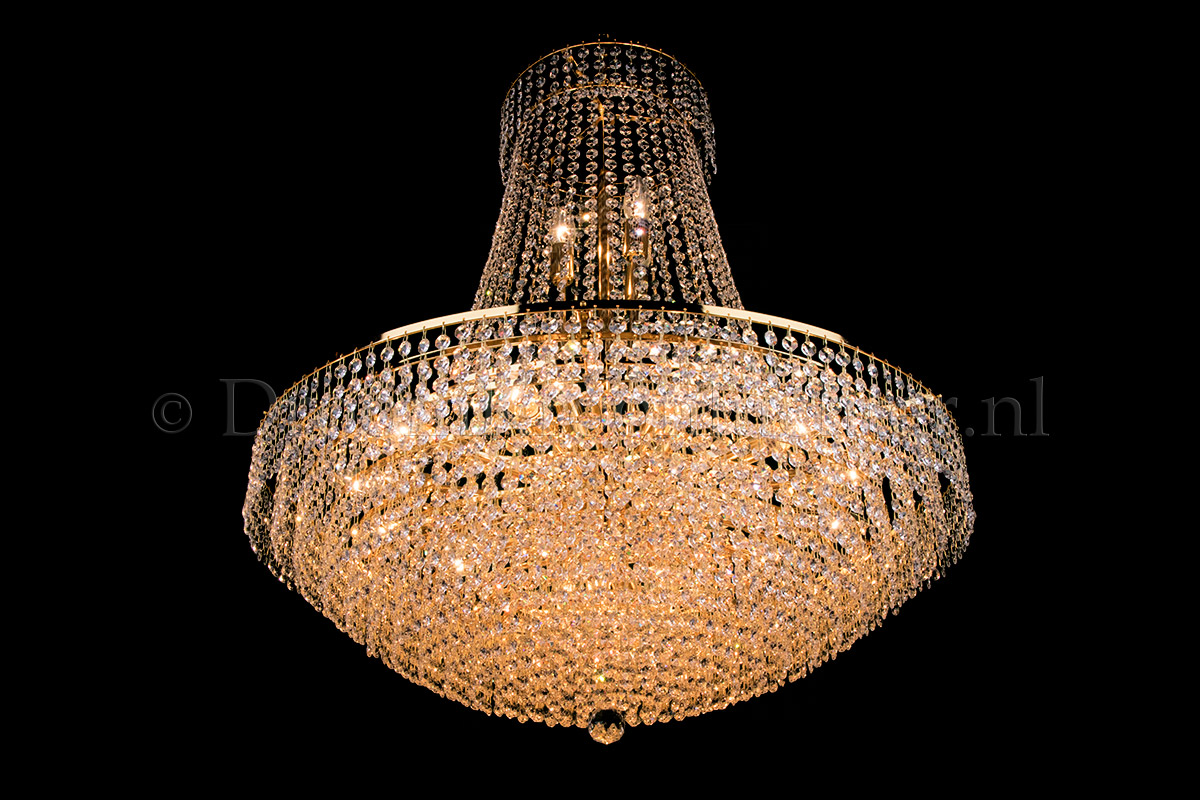 Deze klassieke en meerlaagse zakkroonluchter heeft 24 lichtpunten, een diameter van 80 centimeter en een hoogte van 90cm. De onderkant bevat 14 lagen vol kristal. Deze zakkroonluchter is uitgevoerd in prachtig kristal en voorzien van goud gekleurde randen. De kristallen zakkroonluchter geeft uw ruimte een warme en sfeervolle uitstraling.Een mooie zakkroonluchter voor een droomprijs! Nu te bestellen.