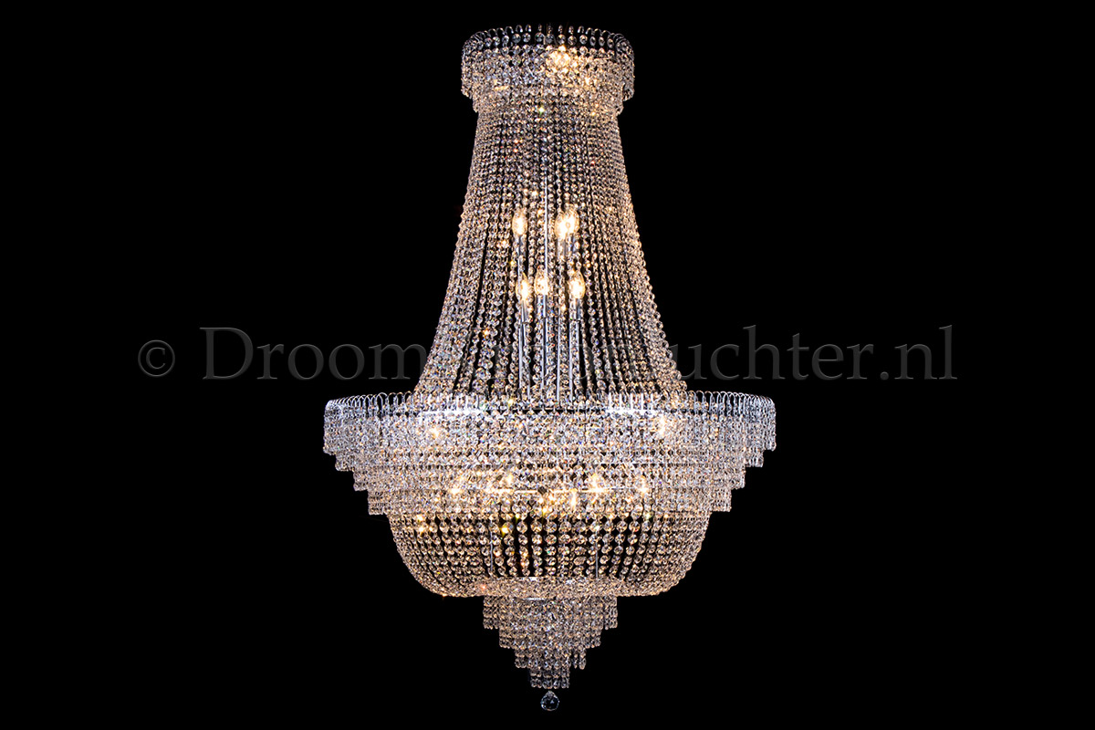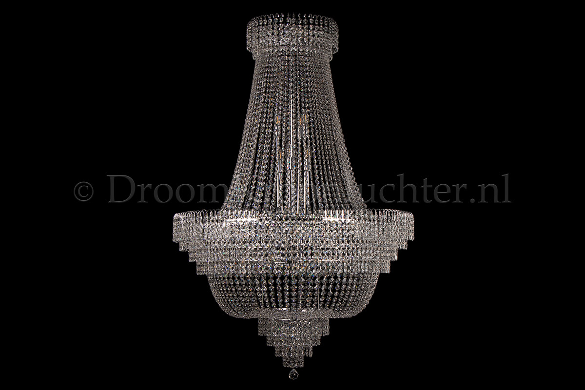 Deze klassieke en meerlaagse zakkroonluchter heeft 34 lichtpunten. De diameter van deze prachtige zakkroonluchter is maar liefst 1.20 meter en heeft een hoogte van maar liefst 180cm! Deze zakkroonluchter is uitgevoerd in prachtig kristal en voorzien van een chromen afwerking. De kristallen zakkroonluchter geeft uw ruimte een warme en sfeervolle uitstraling.Een mooie zakkroonluchter voor een droomprijs! Nu te bestellen.