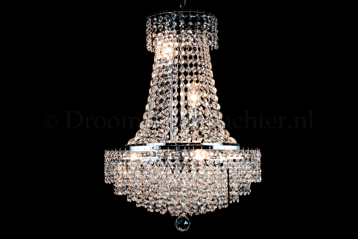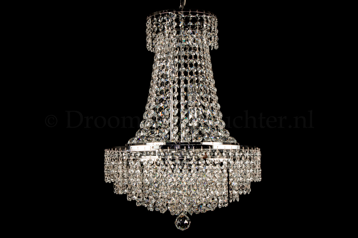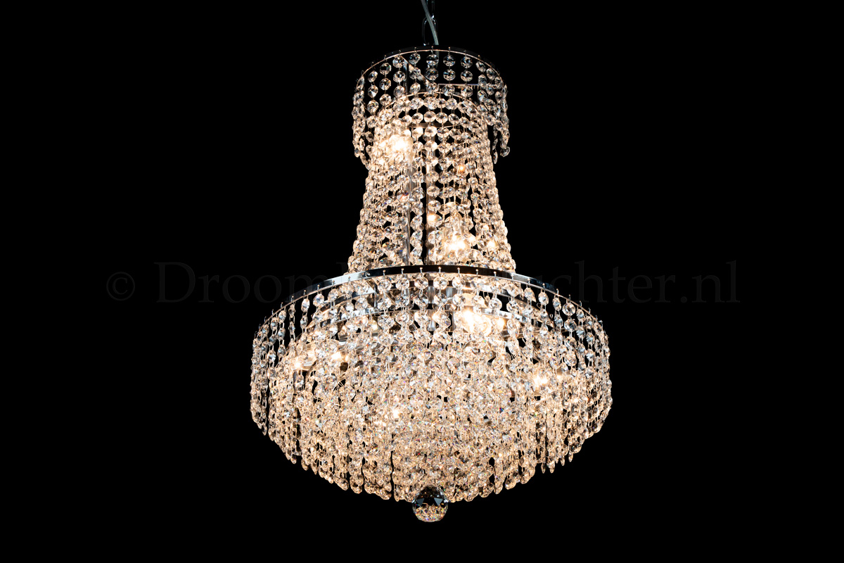 Deze klassieke en meerlaagse zakkroonluchter heeft 6 lichtpunten, een diameter van 40 centimeter en een hoogte van 60cm. De onderkant bevat meerdere ringen vol kristal. Deze zakkroonluchter is uitgevoerd in prachtig kristal en voorzien van chromen randen. De kristallen zakkroonluchter geeft uw ruimte een warme en sfeervolle uitstraling.Een mooie zakkroonluchter voor een droomprijs! Nu te bestellen.