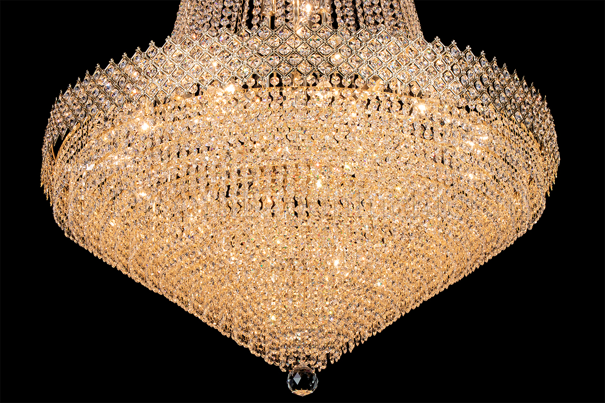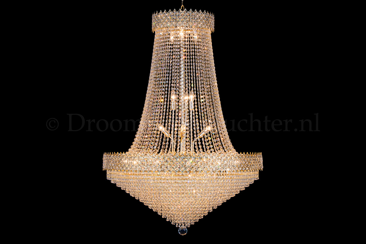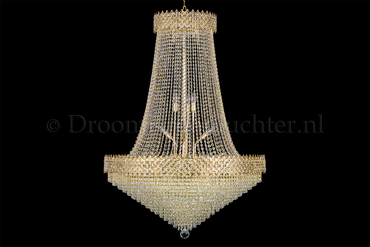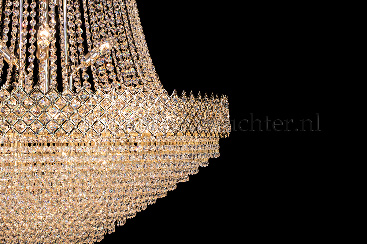 Deze kroonluchter is naast goud ook in de kleuren chroom en mat brons beschikbaar.