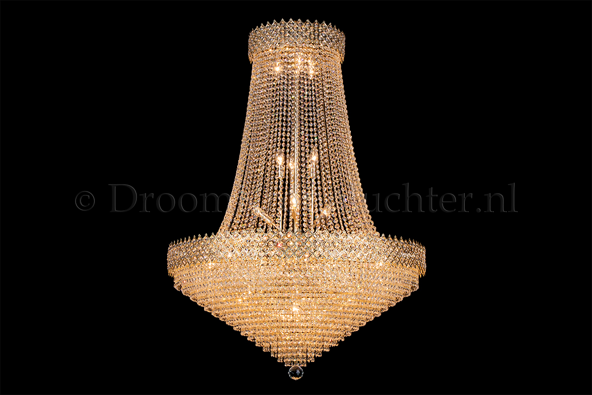Deze prachtige kroonluchter, behangen met schitterende kristallen, heeft 24 lichtpunten, een diameter van 100 centimeter en een hoogte van 140 centimeter. Deze kroonluchter heeft een brede geruite gouden band, waarvan elke ruit gevuld is met een prachtig kristal.De kristallen kroonluchter Amy heeft een koninklijke uitstraling. Sluit u de lamp aan op een dimmer? Dan brengt u altijd de juiste sfeer in huis.