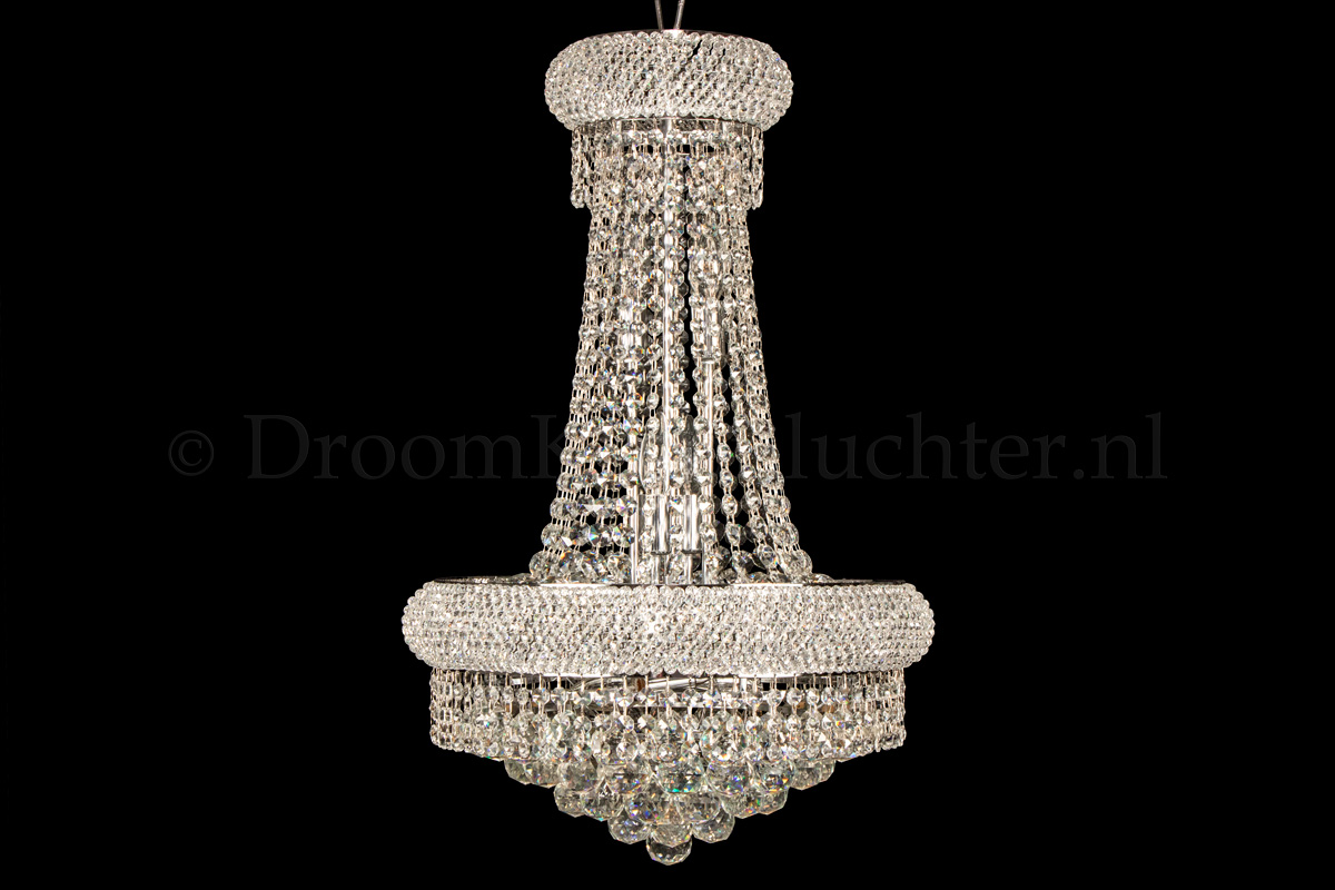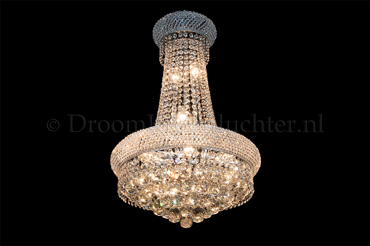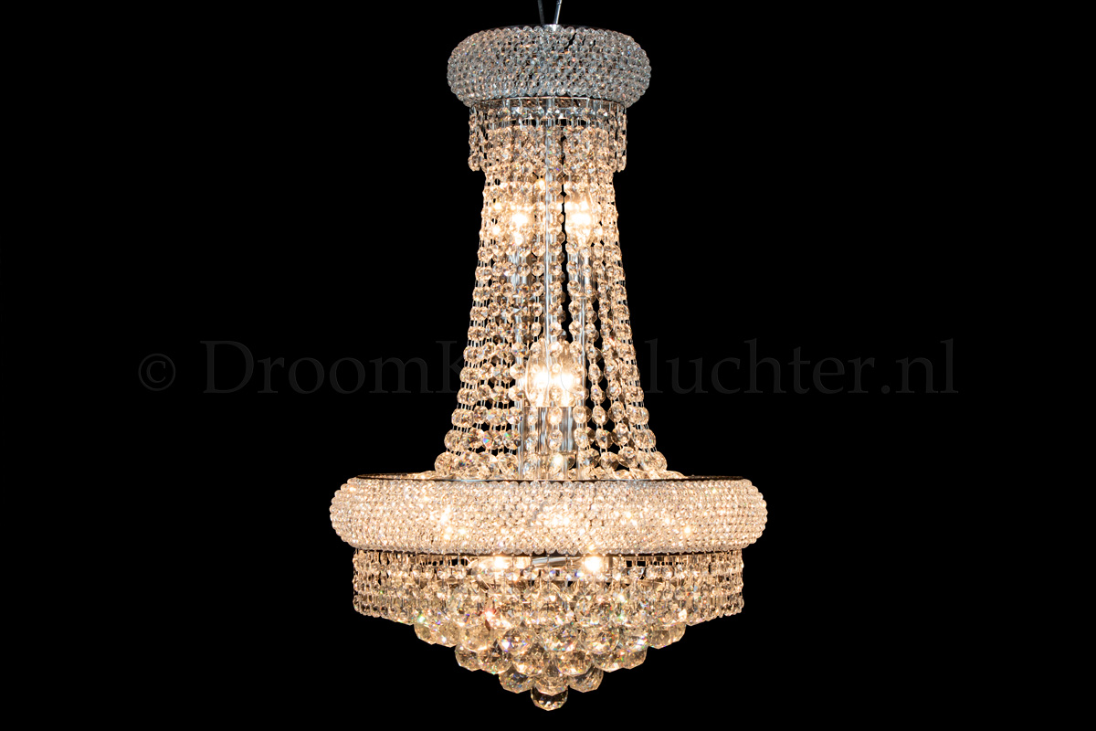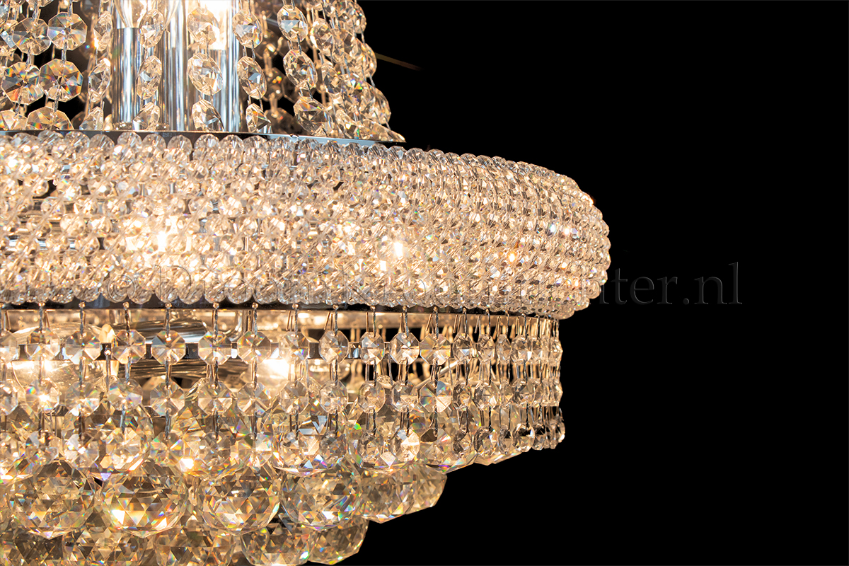 De Gilyana zakkroonluchter is behangen met hoogwaardig kristal en is perfect afgewerkt met verchroomde metalen delen. De strengels zijn hoge kwaliteit kristal met onderaan een schitterende kristallen bol .