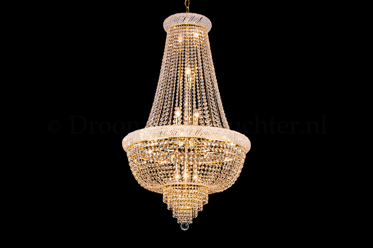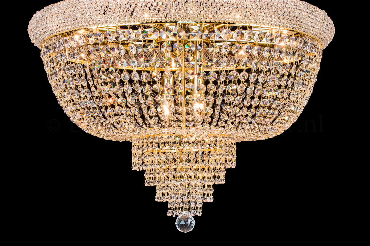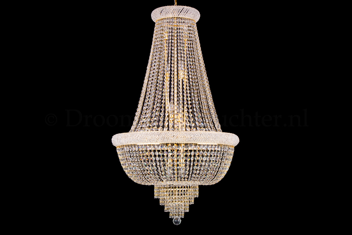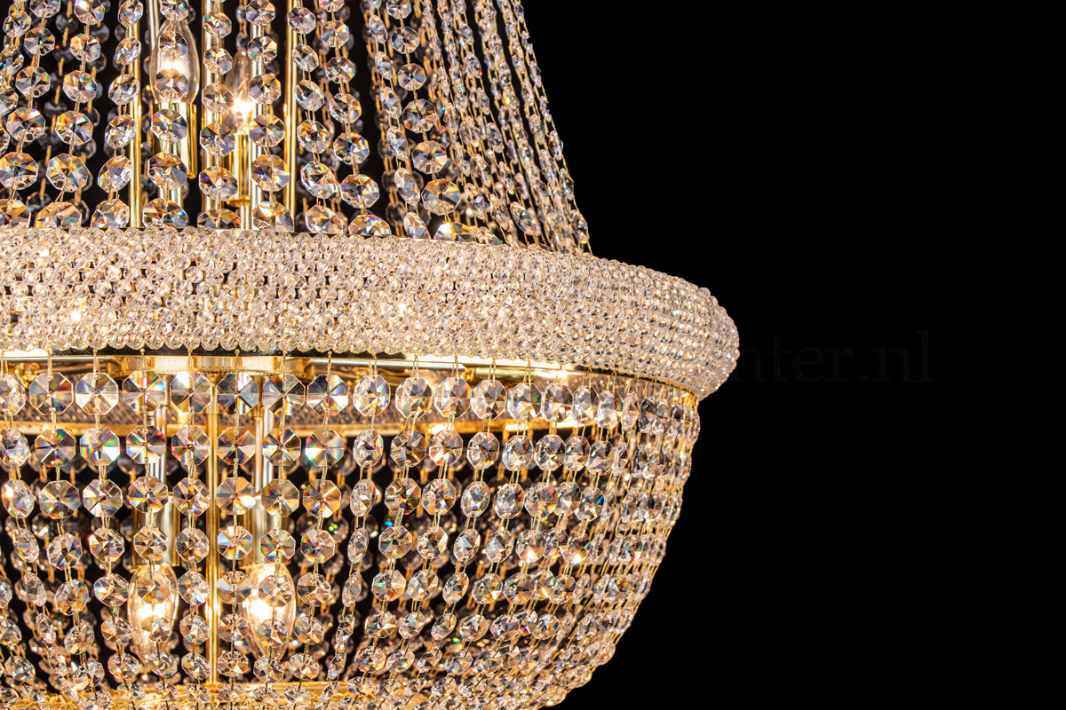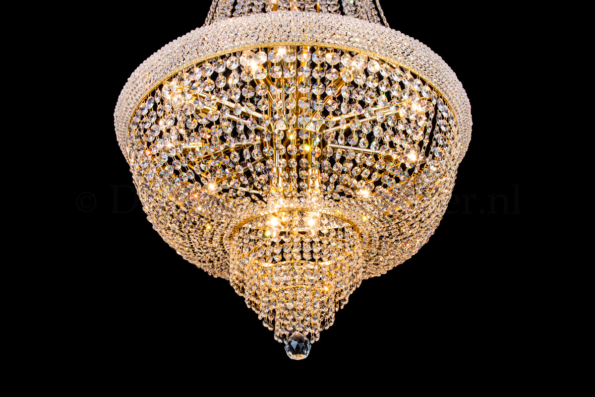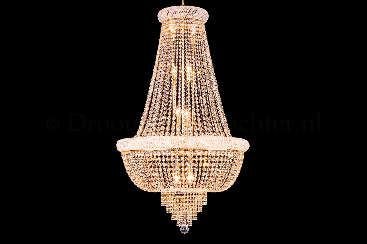 De Palazzo zakkroonluchter is behangen met hoogwaardig kristal en is perfect afgewerkt met goudgekleurde metalen delen. De strengels zijn hoge kwaliteit kristal met onderaan een schitterende kristallen bol .