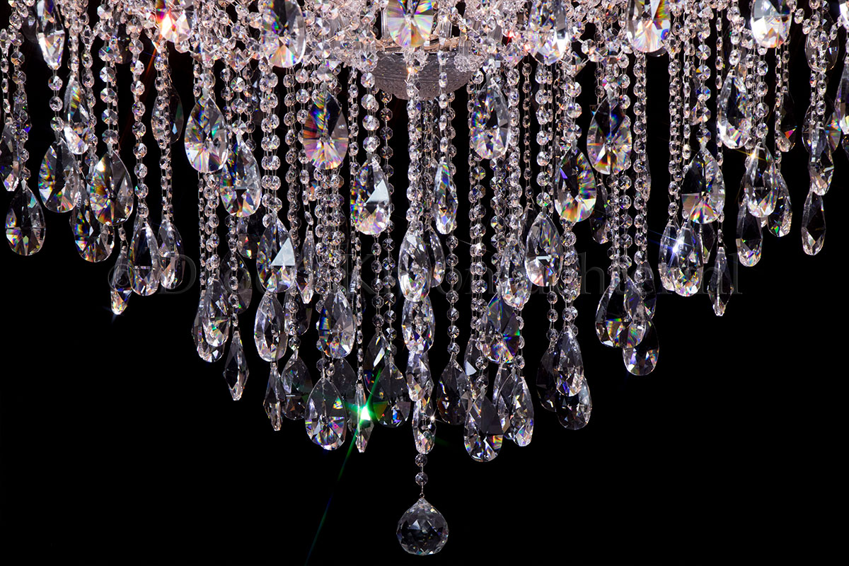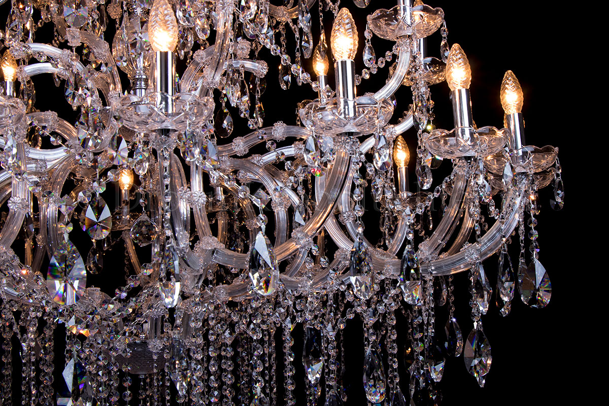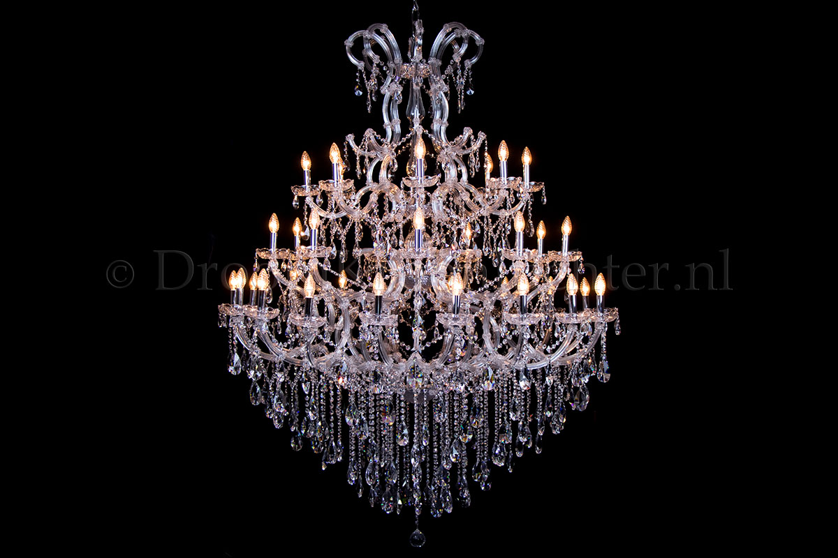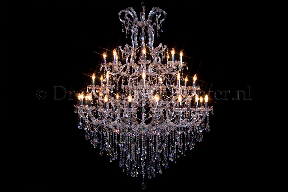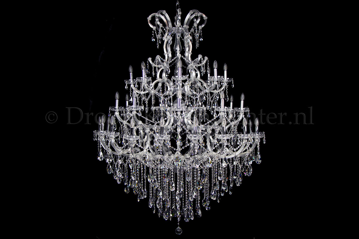Kristallen kroonluchter met 45 lichtpunten en een diameter van 1,50 meter. De Maria Theresa 45 lichts kroonluchter is uitgevoerd in chroom en heeft een diameter van 150cm en een hoogte van 180cm (excl ketting en plafondafdekking). De pegels zijn gemaakt van hoogwaardig kristal, de armen van metaal en glas. Onderaan de kroonluchter hangt een strengel van kristallen pegels met een kristallen bol aan het uiteinde.