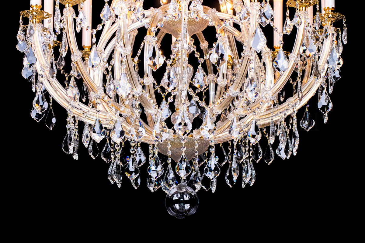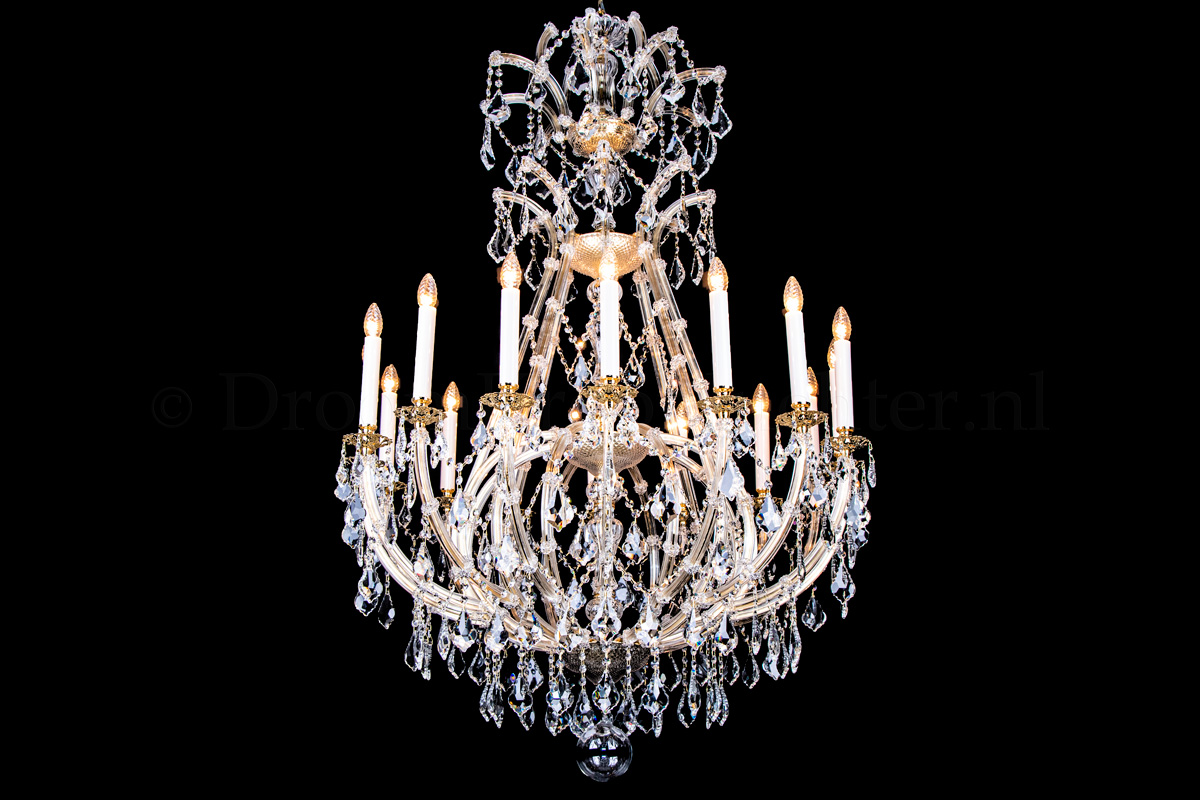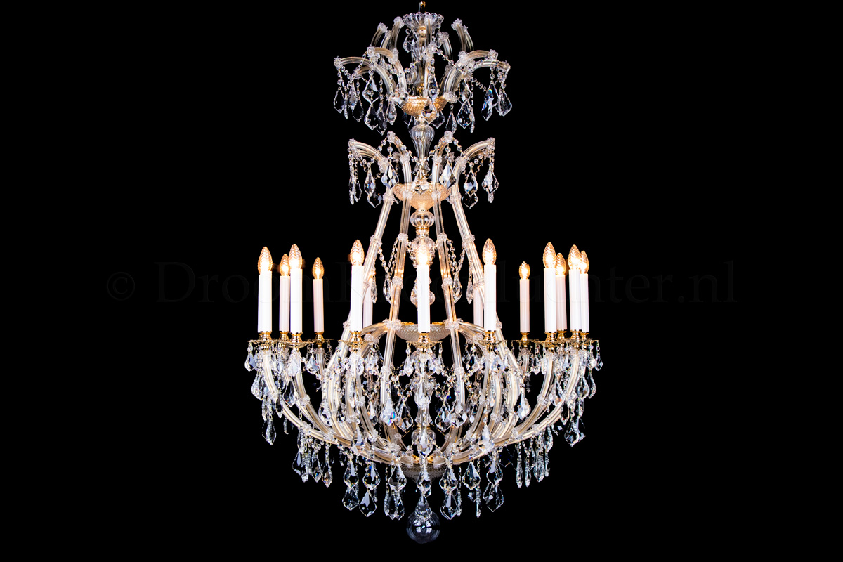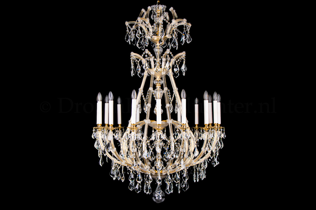 Een sierlijke kristallen kroonluchter met 16 lichtpunten. De Louis Baroque 16 lichts kroonluchter is uitgevoerd in kleur goud en heeft een hoogwaardige afwerking. De pegels zijn van hoogwaardig kristal, het armatuur is een combinatie van metaal en glas. De kaarshulzen zijn maar liefst 17cm hoog en van wit glas. De pegels aan deze kroonluchter zijn extra groot voor een schitterend effect.