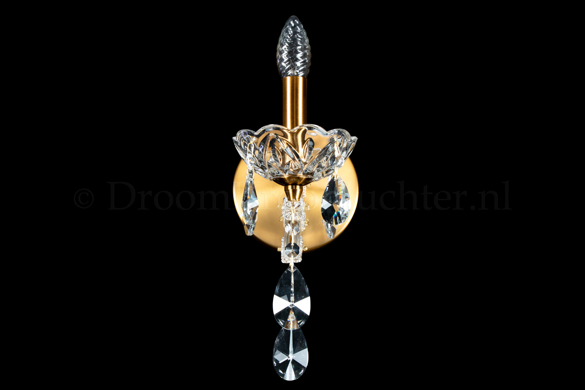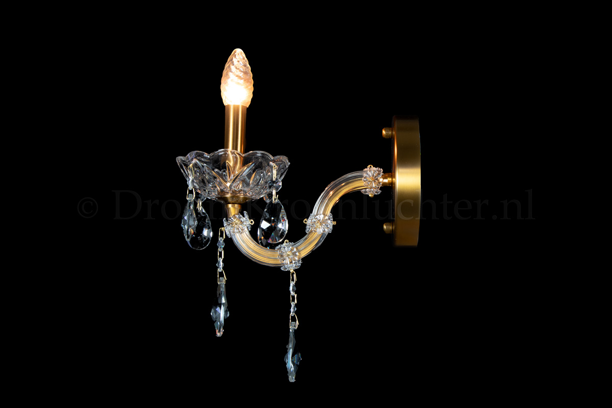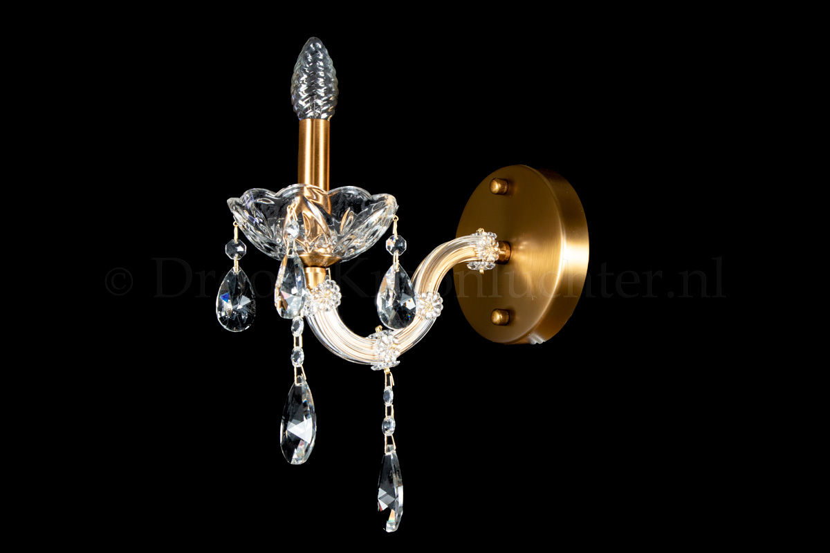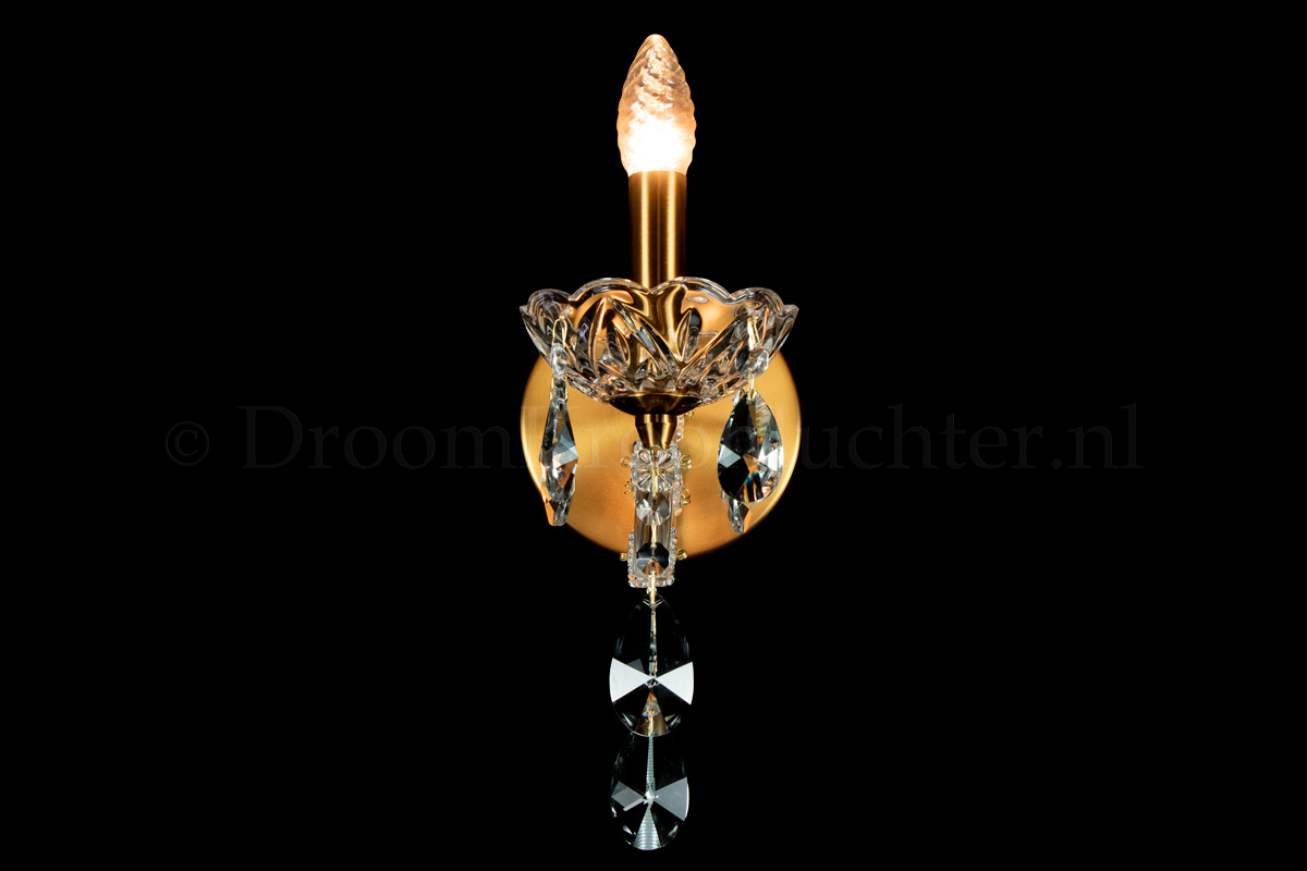 Maria Theresa wandlamp met 5 lichtpunten, verdeeld over 2 etages. Armatuur is van goud met vol krist..