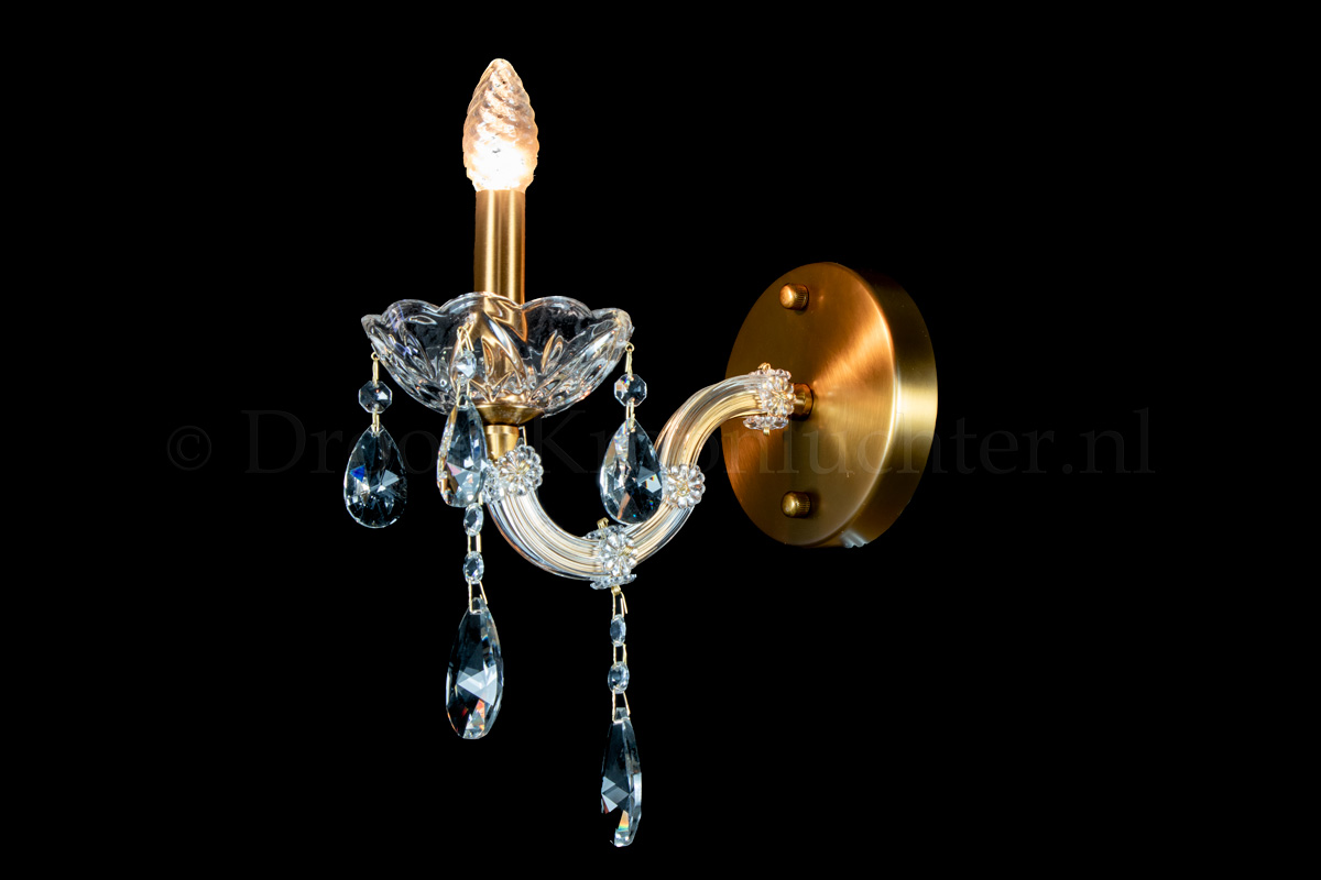 Maria Theresa wandlamp met 2 lichtpunten. Armatuur is van Messing met vol kristallen pegels.Arm..