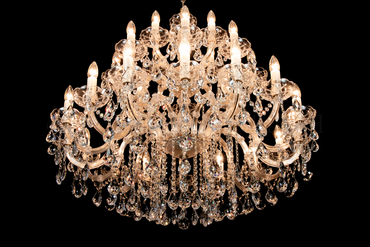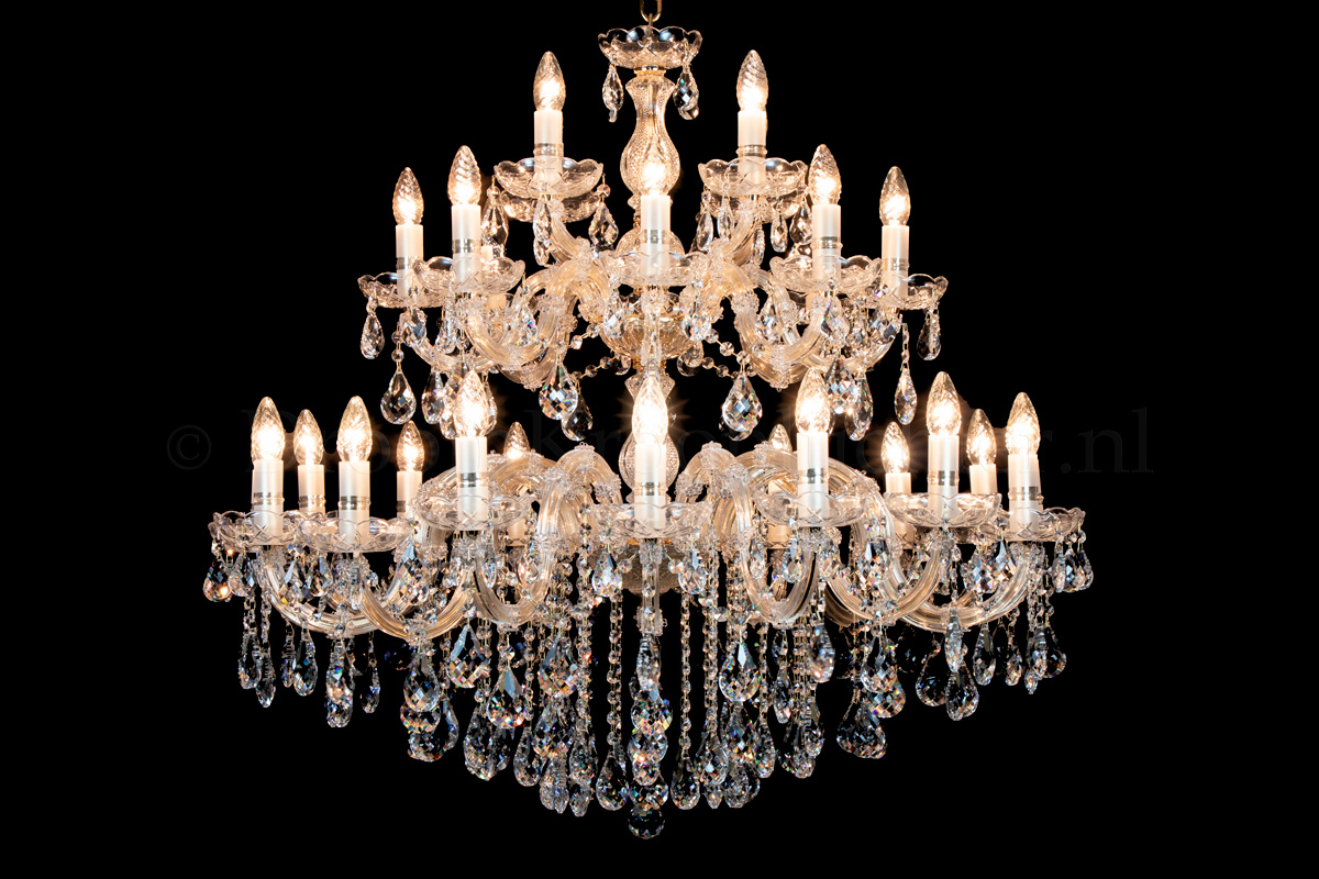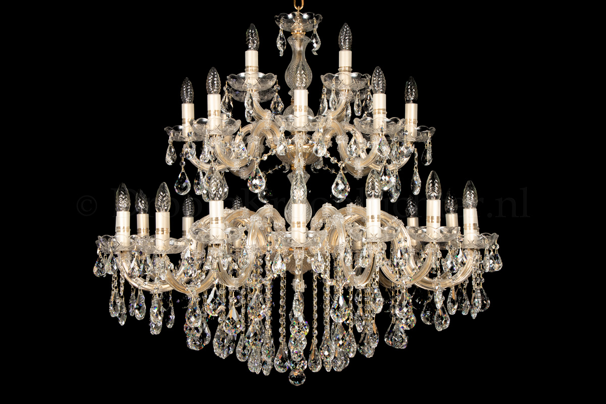 Een prachtige kristallen kroonluchter met 28 lichtpunten, verdeeld over drie etages. De Maria Theresa 28 lichts kroonluchter is uitgevoerd in goud en heeft een perfecte afwerking.